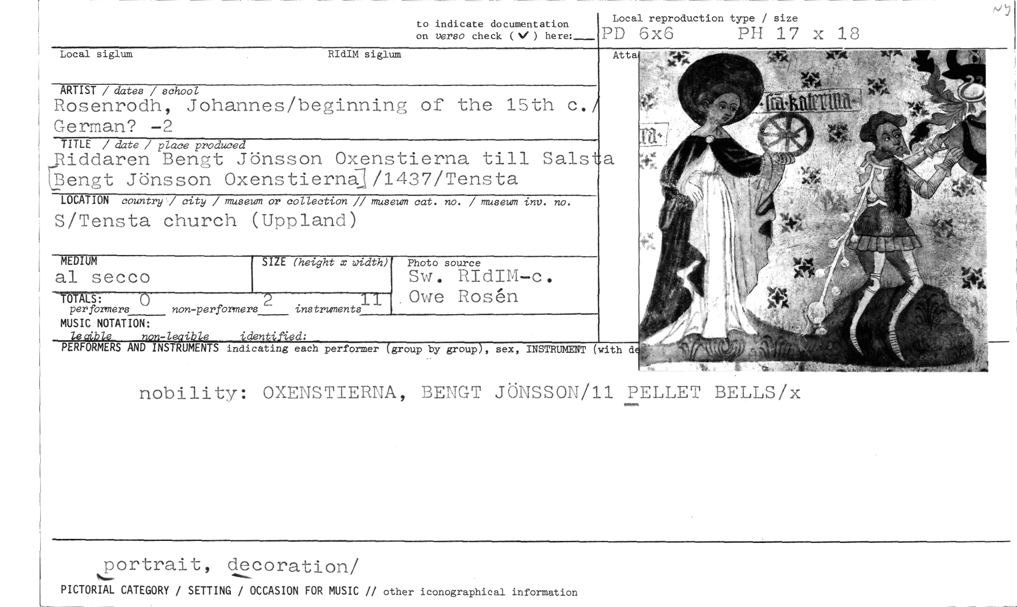 //// nobility: OXENSTIERNA, BENGT JÖNSSON/11 PELLET BELLS/x //// portrait, decoration/ //// PICTORIAL CATEGORY / SETTING / OCCASION FOR MUSIC // other iconographical information //// Local reproduction type / size //// on verso check (V) here: 1)1) 6.:KC) III 17 x 18 //// ocal siglum RIdIM siglum //// mnu/daus/schoa //// Rosenrodh, Johannes/beginning of the 15th c./ German? -2 //// TITLE / date / place produce //// ,Riddaren Bengt Jönsson Oxenstierna till Salsta Bengt Jönsson OxenstiernQ/1437/Tensta //// to indicate documentation //// LOCATION country 7 city / museum or collection // museum cat. no. / museum inv. no. //// S/Tensta church (Uppland) //// tta //// MEDIUM //// al secco //// t-"rb"T"7"---Ö //// 2 perfbrmers non-perfbrmers MUSIC NOTATION: //// instruments //// n— //// Photo source //// Sw. RIdIM-c. Owe Rosen //// S1ZE (hetght x width) //// :okt //// -1 2 e 'den d: //// PERFORMER AND INSTRUMENTS indicating each pertormer group by group , sex, INSTRUMENT (with d ////