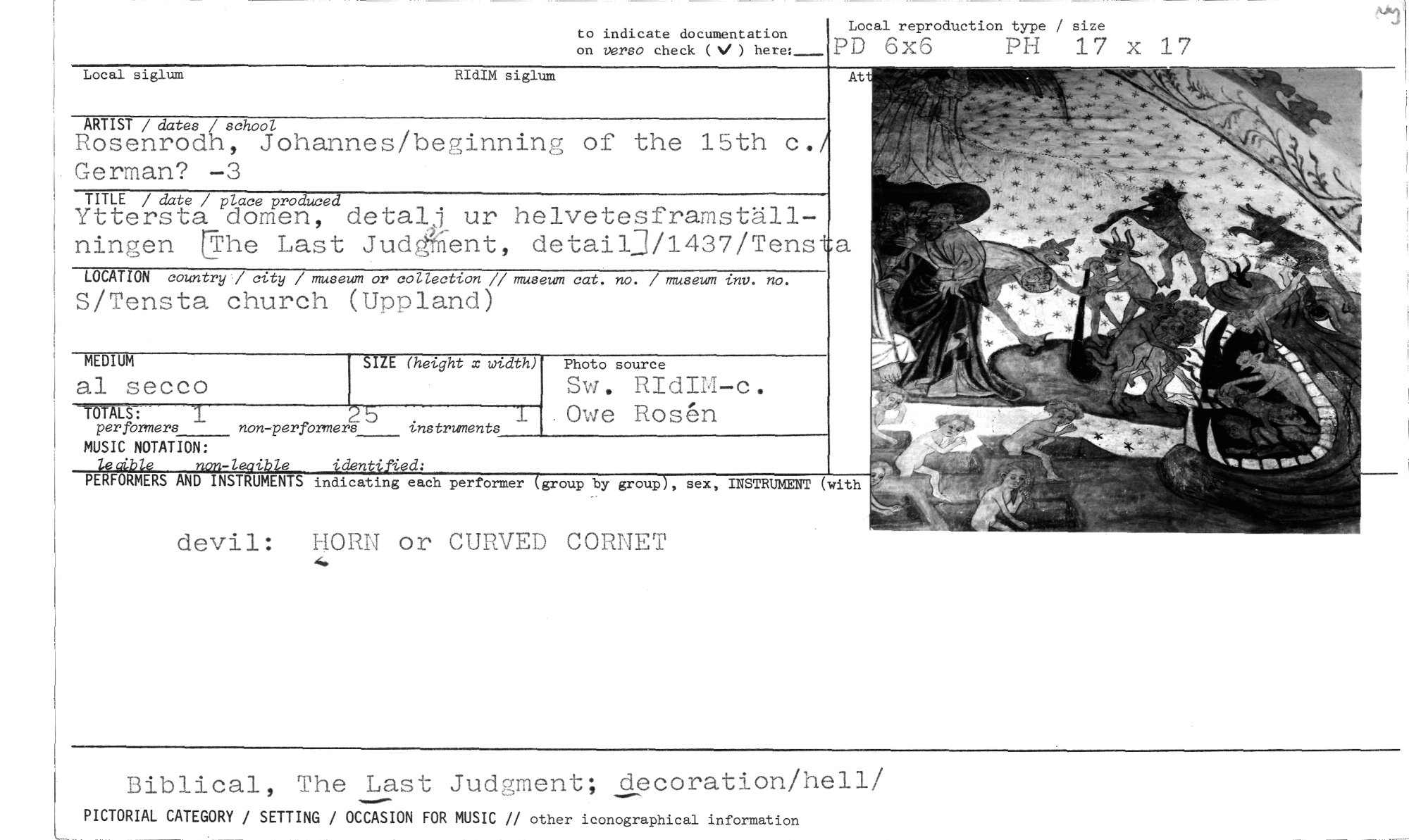 //// e //// *de //// « • //// to indicate documentation Local reproduction type / size //// on ~SO check (V) here:— PD 6x6 PH 17 x 17 //// Local siglum RIdIM siglum //// ARTIST / dates/ school //// Rosenrodh, Johannes/beginning of the 15th c./ German? -3 //// TITLE / date place produced //// Yttersta domen, detalj ur helvetesframställningen The Last JuddKent, detailj/1437/Tensta //// LOCATION country,/ city / museum or collection // museum cat. no. / museum int,. no. //// S/Tensta church (Uppland) //// ISIZE (height x width) //// Photo source //// Sw. RIdIM-c. Owe Rosen //// per formers non-perfbrmers2 5instrunents //// MUSIC NOTATION: //// E FORMERS AND INSTRUMENTS indicating each performer (group by groupi, sex, INSTRUMENT (with //// MEDIUM //// al secco //// devil: HORN or CURVED CORNET //// Biblical, The Last Judgment; decoration/hell/ //// PICTORIAL CATEGORY / SETTING / OCCASION FOR MUSIC // other iconographical information ////