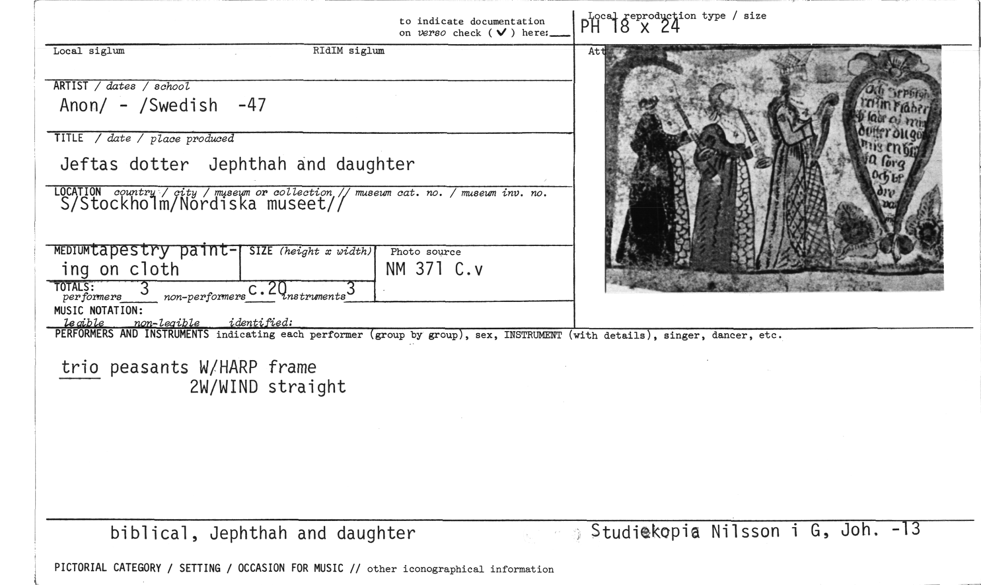 //// to indicate documentation //// nyice.}Aeprodlion type / size t'M I ö X //// on versa check (V) here: //// Local siglum RIdIM siglum //// ARTIST / dates / school //// Anon/ - /Swedish -47 //// TITLE / date / place produced //// Jeftas dotter Jephthah and daughter //// LOCATION country,/ ity / muse or collection 7/ museum cat. no. / museum inv. no. //// 5/Stockholm/Nordiska museet// //// nmmt apestry paint- SIZE (height x width) //// Photo source //// NM 371 C.v //// ing on cloth //// TÖTALS: 3 //// per formers non-perforraersc . 2Qnstruments 3 //// MUSIC NOTATION: //// leaible non-leaible identified: //// PERFORMERS AND INSTRUMENTS indicating each performer //// (group by group), sex, INSTRUMENT (with //// details), singer, dancer, etc. //// trio peasants W/HARP frame //// 2W/WIND straight //// biblical, Jephthah and daughter Studiekopia Nilsson i G, Joh. -13 //// PICTORIAL CATEGORY / SETTING / OCCASION FOR MUSIC // other iconographical information ////