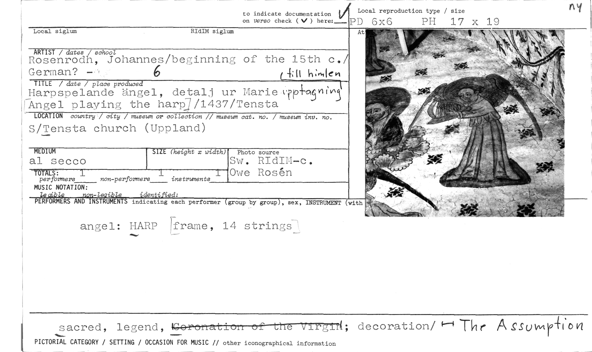 //// ny //// to indicate documentation Local reproduction type / size //// on verso check (%, ) here: 6x6 T-,11 17 x 19 //// Local siglum RIdIM siglum At //// //// ARTIST / dates / school //// Rosenrodh, Johannes/beginning of the 15th c./ //// German? 6 (4 It //// TITLE / date / place produced -I //// Harpspelande ängel, detalj ur MarieAfp-411103 Angel playing the harp7/1437/Tensta //// LOCATION country / city / museum or collection // museum cat. no. / museum inv. no. //// S/Tensta church (Uppland) //// SIZE (heyght x width) //// instruments 17- //// MUSIC NOTATION: //// e 'den d: //// PE FORMERS i dicating each performer group by group , sex, INSTRUMENT (with //// MEDIUM //// al secco //// 1151=-1_ //// per formers //// non-perforner7-1 //// Photo source //// Sw. RIdIM-c. Owe Rosén //// Yn' //// angel: HARP frame, 14 strinvsn //// sacred, legend, • decoration/ -Nr AgSumrovi //// PICTORIAL CATEGORY / SETTING / OCCASION FOR MUSIC // other iconographical information ////