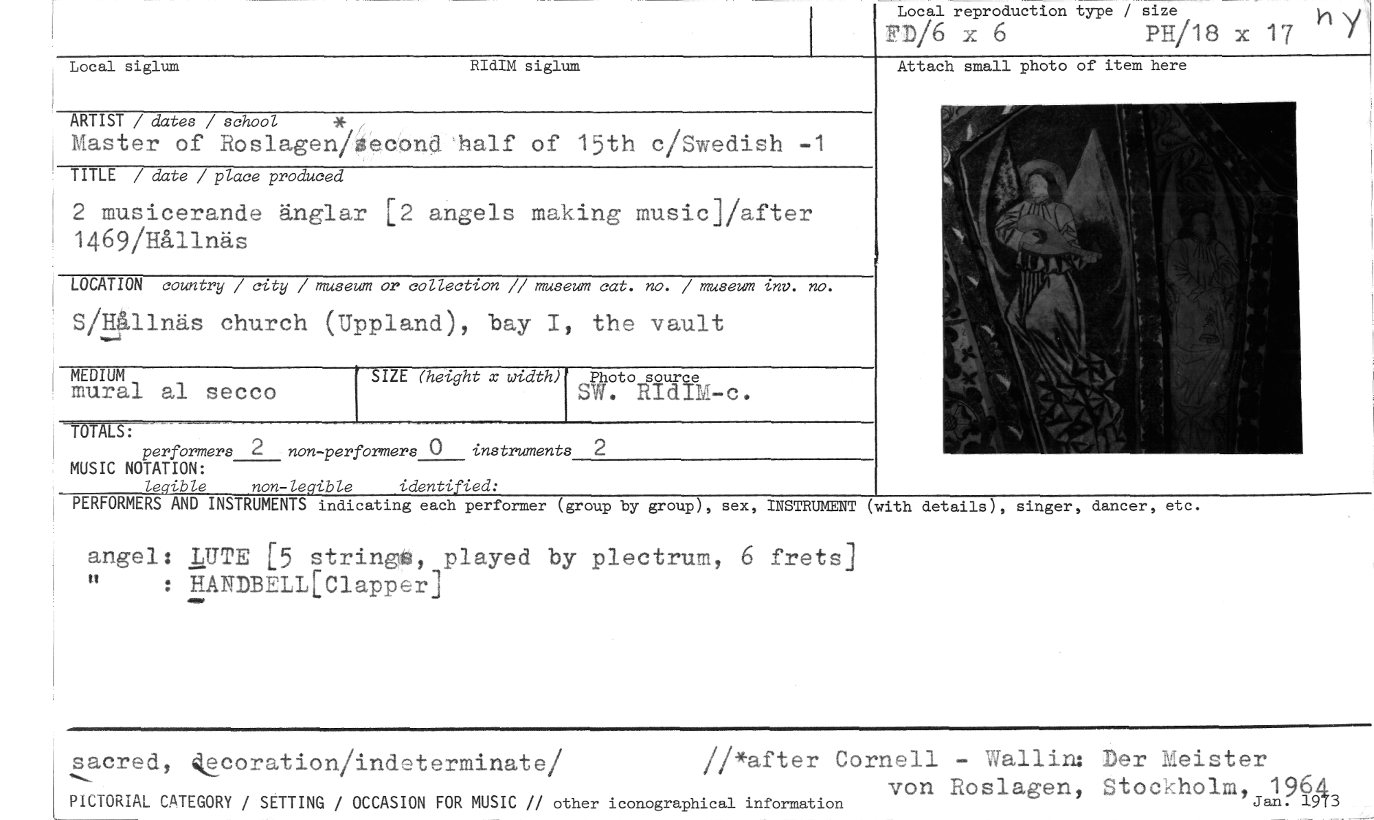 //// Local reproduction type / size //// PD/6 x 6 PH/18 x 17 //// hy //// Attach small photo of item here //// RIdIM siglum //// Local siglum //// ARTIST / dates / school dF //// Master of Roslagen/oecond half of 15th c/Swedish -1 //// TITLE / date / place produced //// 2 musicerande änglar [2 angels making music]/after 1469/Hållnäs //// LOCATMN country / city / museum or collection // museum cat. no. / museum tnv. no. //// S/Hällnäs church (Uppland), bay I, the vault //// MEDIUM SIZE (height x width) swo.todiudriem- //// mural al secco //// //// OTALS: performers 2 non -performers 0 instruments 2 MUSIC NOTATION: //// legible non-legible identified: //// PERFORMERS AND INSTRUMENTS indicating each performer (group by group), sex, INSTRUMENT (with details), singer, //// angel: LUTE [5 stringt, played by plectrum, 6 frets] n : HANDBELL[Clapper] //// dancer, etc. //// sacred, clecoration/indeterminate/ //*after Cornell - Wallin: Der Meister //// von Roslagen, Stockholm, 196 //// PICTORIAL CATEGORY / SETTING / OCCASION FOR MUSIC // other iconographical information Jan. 19 3 ////
