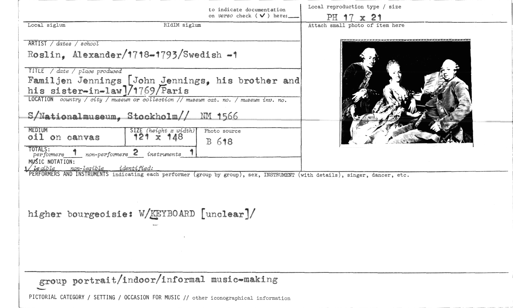 //// to indicate documentation //// on verso check ( ) here:_ //// Local reproduction type / size //// PH 17 x 21 //// Local siglum RIdIM siglum //// Attach small photo of item here //// ARTIST / dates / school //// Roslin, Alexander/1718-1793/Swedish —1 //// TITLE / date / place produced //// Familjen Jennings John Jennings, his brother and //// his sinter—in—law] 17695>aris //// LOCATION country / city / museum or collection // museum cat. no. / museum inv. no. //// S/Nationalmuseum, Rtoal=11^1m// NM 1566 //// MEDIUM //// oil on canvas //// TOMS: //// per formers 1 non-perfbrmers 2 instruments //// MUSIC NOTATION: //// kg4b/e non-Zeaike identified: //// PERFORMERS AND INSTRUMENTS indicating each performer (group by group), sex, INSTRUMENT (with details), singer, dancer, etc. //// higher bourgeoisie: W/WYBOABD funclear]/ //// SIZE (height x width) //// 121 x 148 //// Photo source //// B 618 //// group portrait/indoor/informal music—making //// PICTORIAL CATEGORY / SETTING / OCCASION FOR MUSIC // other iconographical information ////