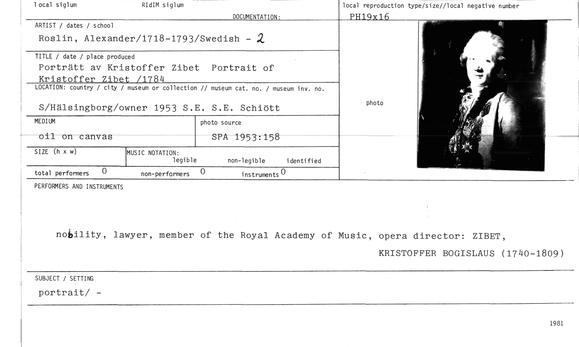 //// local reproduction type/size//local negative number //// PH19x16 //// DOCUMENTATION» //// ARTIST / dates / school //// Roslin, Alexander/1718-1793/Swedish - 2.. //// TITLE / date / place produced //// Porträtt av Kristoffer Zibet Portrait of //// Kristoffer Zibet /1784 //// LOCATION: country / city / museum or collection // museum cat. no. / museum inv. no. //// S/Hälsingborg/owner 1953 S.E. S.E. Schiött //// MEDIUM photo source //// oil on canvas SPA 1953:158 //// SIZE (h x w) MUSIC NOTATION: non-legible identified //// legible //// total performers 0 non-performers 0 instruments 0 //// PERFORMERS AND INSTRUMENTS of the Royal Academy //// nobility, lawyer, member //// local siglum RIdIM siglum //// photo //// of Music, opera director: ZIBET, KRISTOFFER BOGISLAUS (1740-1809) //// SUBJECT / SETTING //// portrait/ - //// 1981 ////