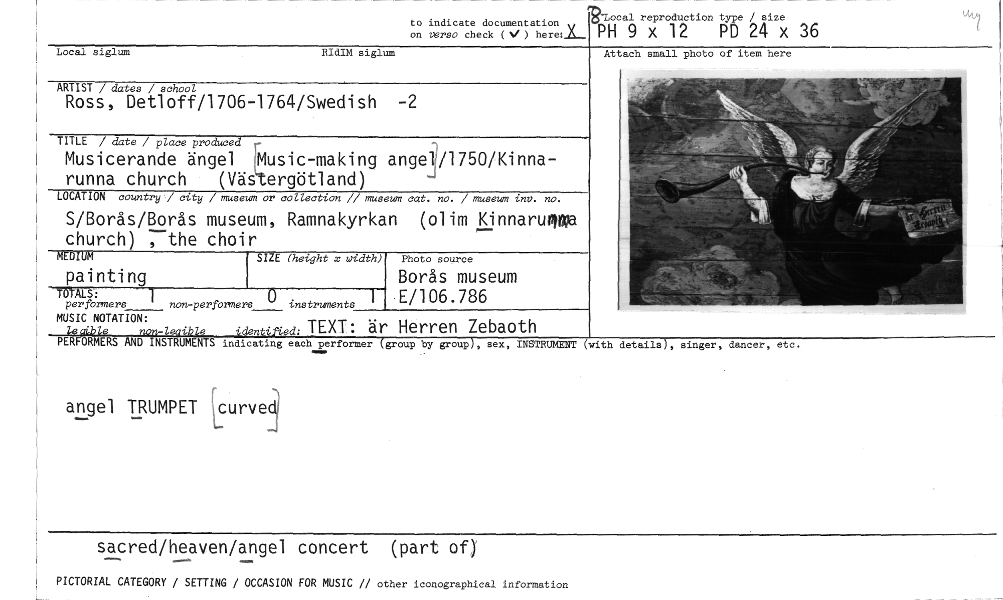 //// Imbocal reproduction type / size //// to indicate documentation //// on versa check (4./ ) wPH 9 x 12 PD 24 x 36 //// Local siglum RIdIM siglum //// Attach small photo of item here //// ARTIST / dates / school //// Ross, Detloff/1706-1764/Swedish -2 //// TITLE / date / place produced r //// Musicerande ängel [Music-making ange1/1750/Kinna- //// runna church (Västergötland) //// LOCATION country / city / museum or collection // museum cat. no. / museum inv. no. //// S/Borås/Borås museum, Ramnakyrkan (olim Kinnaruoge church) the choir //// ME IUM SIZE (height x width) Photo source //// painting Borås museum //// per formers I non-performeji instruments 1 E/106.786 //// TOTALS: //// MUSIC NOTATION: //// leoihle non-lecible id2ntified: TEXT: är Herren Zebaoth //// PERFORMERS AND INSTRUMENTS indicating each performer (group by group), sex, INSTRUMENT (with details), singer, dancer, etc. //// angel TRUMPET rt:curve //// sacred/heaven/angel concert (part of)" //// PICTORIAL CATEGORY / SETTING / OCCASION FOR MUSIC // other iconographical information ////