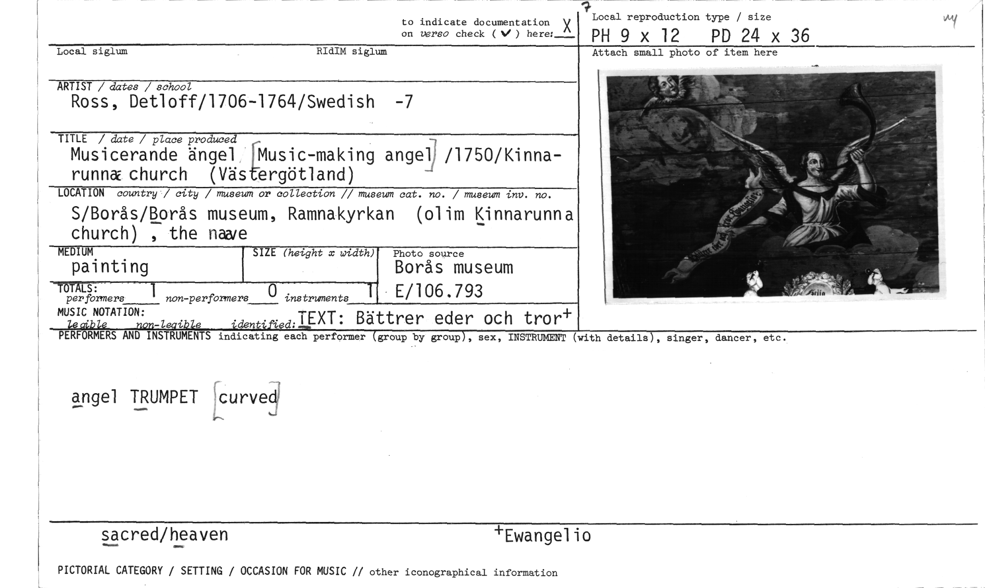 //// to indicate documentation on versa check ( V ) here: //// Local reproduction type / size //// PH 9 x 12 PD 24 x 36 //// Local siglum RIdIM siglum //// ARTIST / dates / school //// Ross, Detloff/1706-1764/Swedish -7 //// TITLE / date / place produced //// Musicerande ängel Music-making angel /1750/Kinnarunnai church (Väs ergötland) //// LOCATION country / city / museum or collection // museum cat. no. / museum inv. no. //// S/Borås/Borås museum, Ramnakyrkan (olim Kinnarunna church) , the name //// SIZE (height x width) //// T //// per formers non-performers ° instruments //// LS: //// MUSIC NOTATION: . TEXT. Bättrer eder och tror+ //// 4yriine non-logible identl,fted:—. • //// MEDIUM //// painting //// Photo source //// Borås museum E/106.793 //// Attach small photo of item here //// PER ORMERS AND INSTRUMENTS indicating each performer (group by group), sex, INSTRUMENT (with details), singer, dancer, etc. //// angel TRUMPET 'curve4 //// 4r, //// sacred/heaven +Ewangelio //// PICTORIAL CATEGORY / SETTING / OCCASION FOR MUSIC // other iconographical information ////