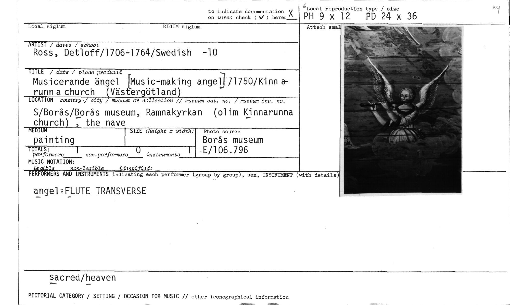 //// r //// per formers non-perfbrmers instruments //// to indicate documentation on versa check (V ) //// Local reproduction type / size //// PH 9 x 12 PD 24 x 36 //// Local siglum RIdIM siglum //// ARTIST / dates / school //// Ross, Detloff/1706-1764/Swedish -10 //// TITLE / date / place produced //// Musicerande ängel [Music-making angel] /1750/Kinn a- //// runn a church (Västergötland) //// LOCATION country ./ city / museum or collection // museum cat. no. / museum inv. no. //// S/Borås/Borås museum, Ramnakyrkan (olim Kinnarunna //// church) , the nave //// MEDIUM SIZE (height x width) //// painting //// MUSIC NOTATION: //// leuible non-leaible identified: //// PERFORMERS AND INSTRUMENTS indicating each performer (group by group), sex, //// angel:FLUTE TRANSVERSE //// Photo source //// Borås museum E/106.796 //// Attach smal //// INSTRUMENT (with detaila) //// sacred/heaven //// PICTORIAL CATEGORY / SETTING / OCCASION FOR MUSIC // other iconographical information ////