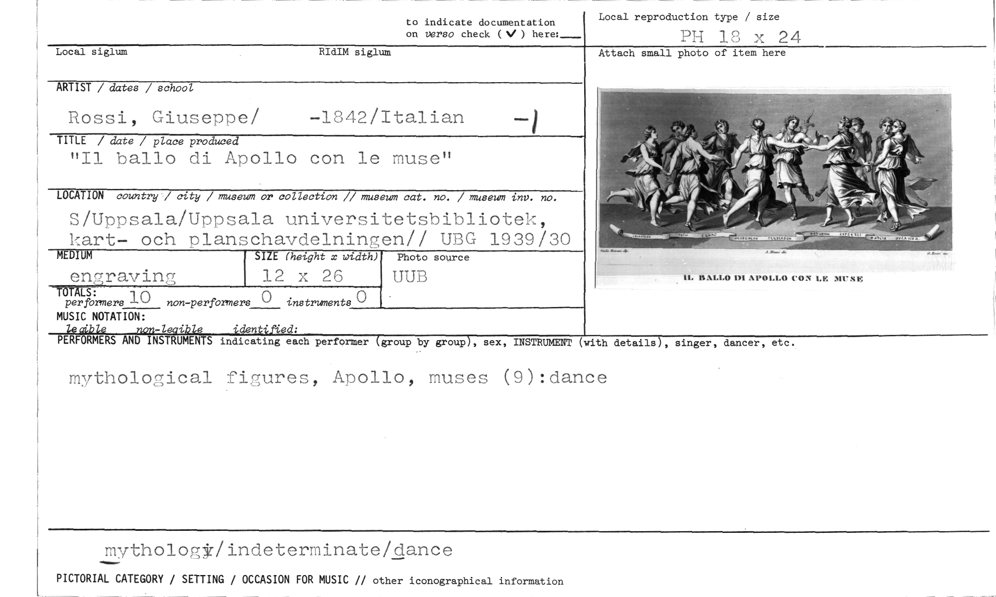 //// to indicate documentation Local reproduction type / size //// on verso check (V) here: PH 18 x 24 //// ocal siglum RIdIM siglum //// ARTIST / dates / school //// Rossi, Giuseppe/ -1842/Italian //// TITLE / date / place produced //// "Il ballo di Apollo con le musen //// LOCATION countryJ city / museum or collection // museum cat. no. / museum any. no. //// S/Uppsala/Uppsala universitetsbibliotek, kart- och planschavdelningen// UBG 1939/30 //// MEDIUM SIZE (height x width) Photo source //// engraving 12 x 26 UUB Attach small photo of item here //// IL BALLO DI APOLLO CON I.M. MINE //// TOTALS: //// per formers ]-() non-performers () instruments //// MUSIC NOTATION: //// PEigitlä pon-legible identified: //// LS AND INSTRUMENTS indicating each performer (group by group), sex, INSTRUMENT //// (with details), singer, dancer, etc. //// mythological figures, Apollo, muses (9):dance //// mythologt/indeterminate/dance //// PICTORIAL CATEGORY / SETTING / OCCASION FOR MUSIC // other iconographical information ////