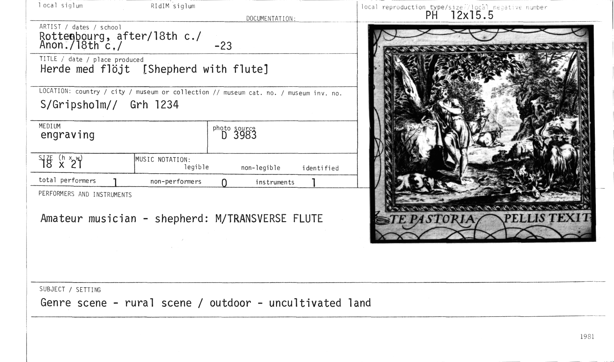 //// 1 ocal siglum //// ve number //// RIdIM siglum //// DOCUMENTATION: //// lotal reproduction tyPe/size;71ocå //// PH 12x15.5 //// ARTIST / dates / school //// Rottenbourg, after/18th c./ Anon./18th c,/ -23 //// TITLE / date / place produced //// Herde med flöjt [Shepherd with flute] //// LOCATION: country / city / museum or collection // museum cat. no. / museum inv. no. //// S/Gripsholm// Grh 1234 //// MEDIUM //// engraving //// aiff (›t >å //// MUSIC NOTATION: //// legible //// non-performers //// non-legible identified //// instruments 1 //// ;t1t. //// total performers //// PERFOMERS AND INSTRUMENTS //// Amateur musician - shepherd: M/TRANSVERSE FLUTE //// SUBJECT / SETTING //// Genre scene - rural scene / outdoor - uncultivated land ////