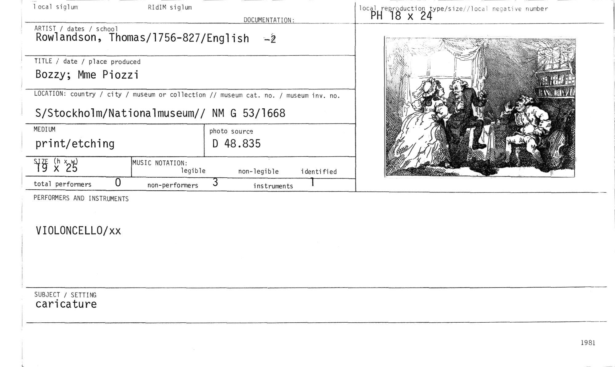 //// iocal siglum RIdIM siglum //// local_Hreproduction type/size//local negative number //// P 18 x 24 //// DOCUMENTATION: //// ARTIST / dates / school //// Rowlandson, Thomas/1756-827/English -2 //// TITLE / date / place produced //// Bozzy; Mme Piozzi //// LOCATION: country / city / museum or collection // museum cat. no. / museum inv. no. //// S/Stockholm/Nationalmuseumn NM G 53/1668 //// MEDIUM //// print/etching //// MUSIC NOTATION: //// legible non-legible identified //// total performers 0 non-performers 3 instruments 1 //// (>'(' x2t //// photo source //// D 48.835 //// PERFORMERS AND INSTRUMENTS //// VIOLONCELLO/xx //// SUBJECT / SETTING //// caricature //// 1981 ////