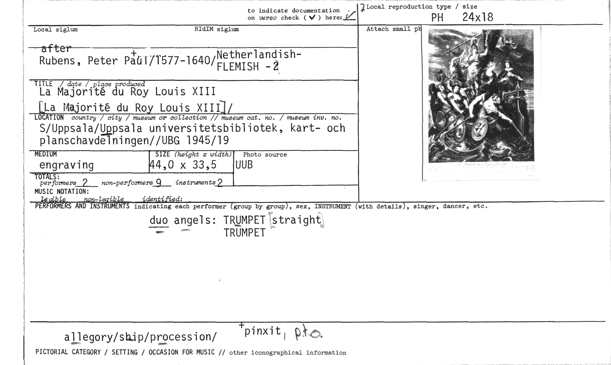 //// to indicate documentation //// on verso check (N/ ) here: .1.! //// 5/Local reproduction type / size //// PH 24x18 //// Attach small pt //// Local siglum RIdIM siglum //// -after //// 577- //// . //// Rubens, Peter PabI/1577-1640/FLEMISH -2 //// TITLE / date /.placeproduced //// La Majorit du Roy Louis XIII LLa Majorite du Roy Louis XIII]/ //// LOCATION country / city / museum or collection // museum cat. no. / museum inv. no. //// S/Uppsala/lIpsala universitetsbibliotek, kart- och planschavdelningen//UBG 1945/19 //// MEDIUM SIZE (hetght x width) //// engraving 44,0 x 33,5 //// Photo source //// UUB //// TOTALS: //// performers2__ non-performers_9___ instrumental? //// MUSIC NOTATION: //// non-leaible PERFORMERS AND INSTRUMENTS indicating each performer (group by group), sex, INSTRUMENT (with details), singer, dancer, etc. //// duo angels: TRUMPELstraight, //// TRUMPET //// + //// allegory/sLip/procession/ pinxiti //// PICTORIAL CATEGORY / SETTING / OCCASION FOR MUSIC // other iconographical information ////