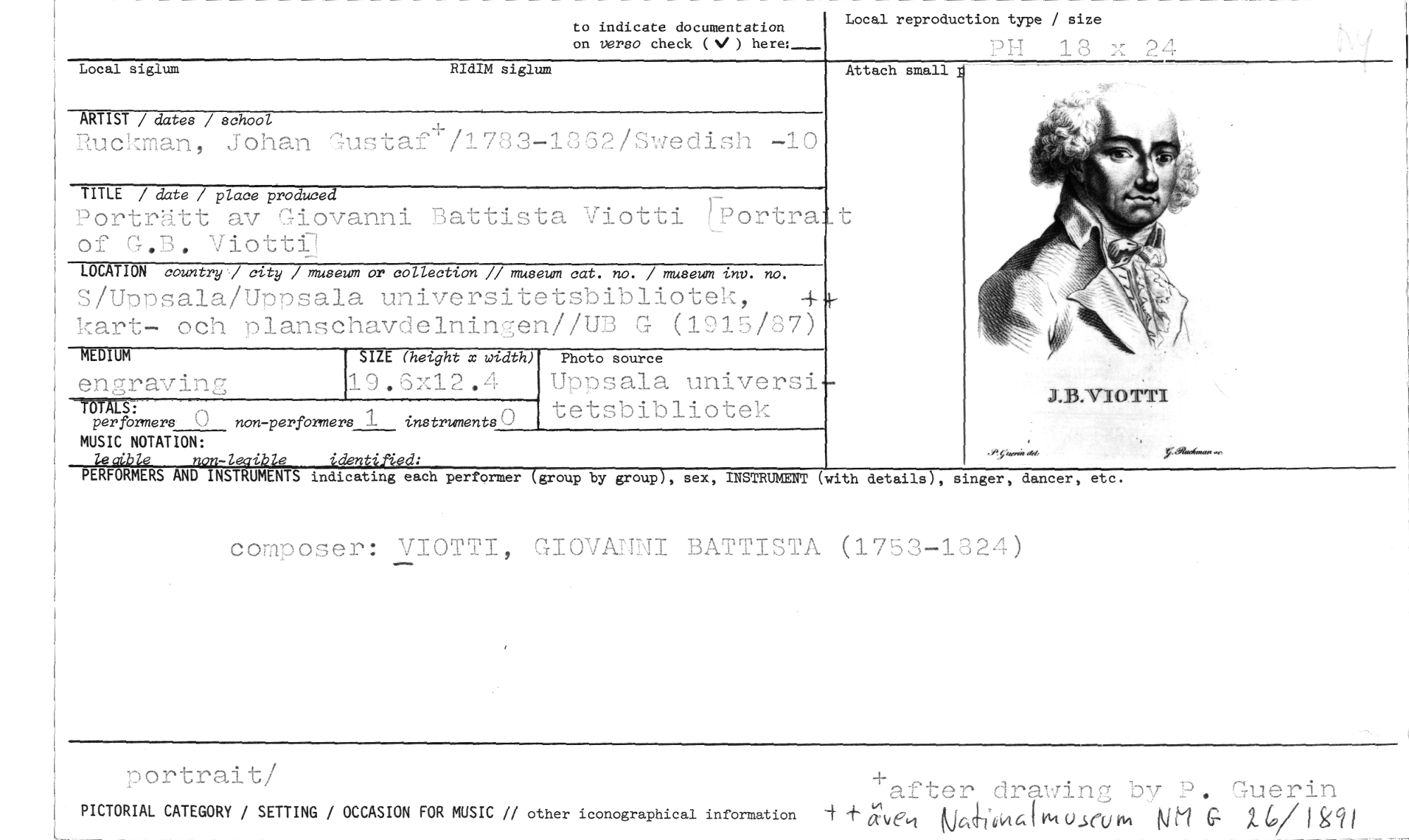 //// to indicate documentation Local reproduction type / size //// on verso check (,./ ) here: PH 1 8 LL 94 //// Local siglum RIdIM siglum //// ARTIST / dates / school //// Ruckman, Johan Gustaf /1733-13ö2/Swedish -10 //// TITLE / date / place produced //// Porträtt av Giovanni Battista Viotti P?ortra of G.B. Viotti:7 //// LOCATION country 7 city / museum or collection // museum cat. no. / museum tnv. no. //// S/Uppsala/Uppsala universitetsbibliotek, kart- och planschavdelningen//UB G (1915/87) //// D //// engravin7 //// TOTALS: //// per formers 0 non -performers 1 instruments //// MUSIC NOTATION: //// lsailole non-lev-112U identiPieed: //// PERFORMERS AND INSTRUMENTS indicating each pertormer (group by group), sex, INSTRUMENT (with details), singer, dancer, etc. //// composer: VIOTTI, GIOVANNI BATTISTA (1753-1824) //// ZE lhezght x width) //// 19.6x12.4 //// Photo source //// Uppsala universi tetsbibliotek //// Attach small //// t //// portrait/ //// +after drawing by P. Guerin //// PICTORIAL CATEGORY / SETTING / OCCASION FOR MUSIC // other ioonographicel information kjakkWIGt Ojr(j N111 2.. ‘9/ I fscil ////