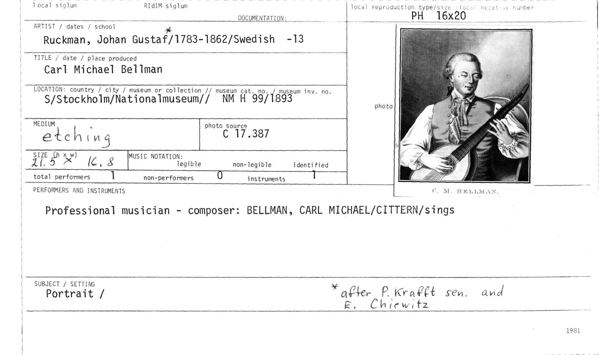 //// 1 ocal siglum RIdIM siglum //// lotal reproduction type/size 'lotal net'ave number //// PH 16x20 //// DOCUMENTATION: //// ARTIST / dates / school //// Ruckman, Johan Gustaf/1783-1862/Swedish -13 //// TITLE / date / place produced //// Carl Michael Bellman //// museum or collection // museum cat. no.j museum inv. no. //// tionalmuseum// NM H 99/1893 //// LOCATION: country / city / //// S/Stockholm/Na //// photo source //// C 17.387 //// MEDIUM r //// e-L c h :143 jgEssi, n w) //// fx //// MUSIC NOTATION: //// legible non-legible identified //// total performers 1 //// non-performers 0 instruments 1 //// photo //// PERFORMERS AND INSTRUMENTS //// Professional musician composer: BELLMAN, CARL MICHAEL/CITTERN/sings //// SUBJECT / SETTING //// Portrait / //// agkr R Kriag'Ci sem. avel //// K. Ck ieuvifz //// 1981 ////