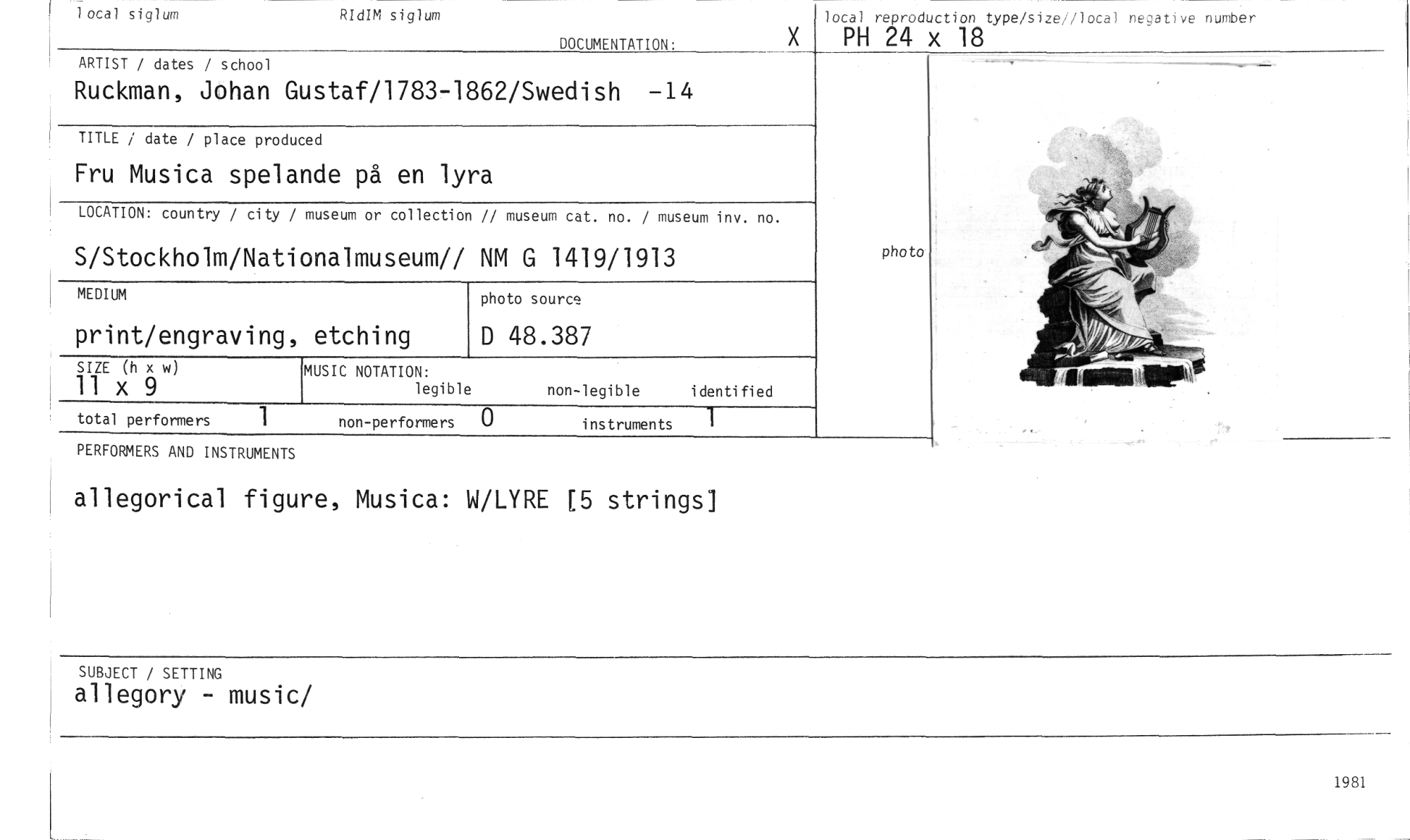 //// local siglurn RIdIM siglum //// DOCUMENTATION: //// local reproduction type/size//local negative nutuber //// PH 24 x 18 //// ARTIST / dates / school //// Ruckman, Johan Gustaf/1783-1862/Swedish -14 //// TITLE / date / place produced //// Fru Musica spelande på en lyra //// LOCATION: country / city / museum or collection // museum cat. no. / museum inv. no. //// S/Stockholm/Nationalmuseum// NM G 1419/1913 //// photo source //// D 48.387 //// SIZE (h x w) //// 11 x 9 //// total performers 1 non-performers 0 instruments 1 //// MEDIUM //// print/engraving, etching //// MUSIC NOTATION: //// legible non-legible identified //// photo //// PERFORMERS AND INSTRUMENTS //// allegorical figure, Musica: W/LYRE [5 strings] //// SUBJECT / SETTING //// allegory - music/ //// 1981 ////