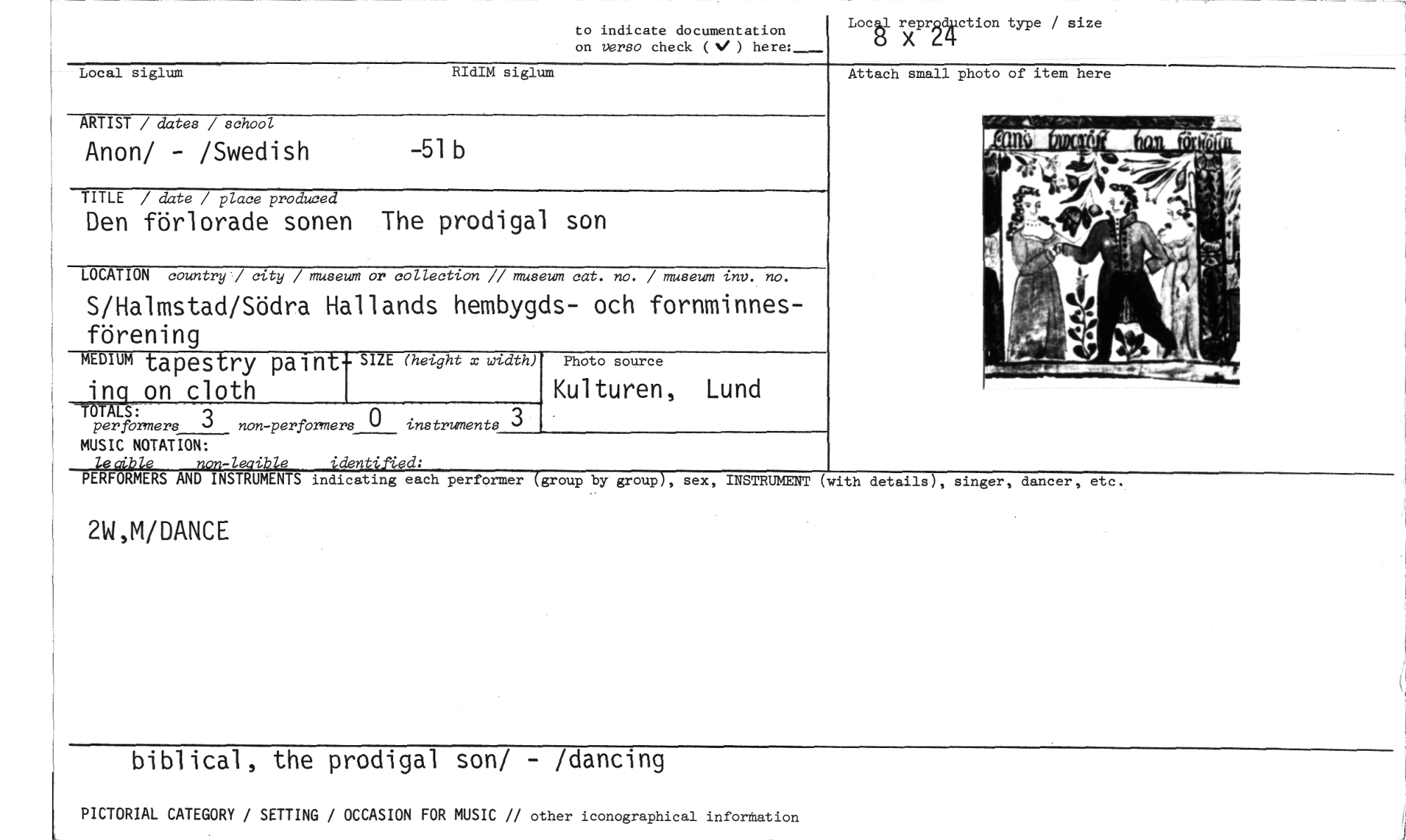 //// to indicate documentation on verso check ( V ) //// Locpj. repnetion type / size //// ö X C //// Local siglum RIdIM siglum //// ARTIST / dates / school //// Anon/ - /Swedish -51 b //// TITLE / date / place produced //// Den förlorade sonen The prodigal son //// LOCATION country / city / museum or collection // museum cat. no. / museum inv. no. //// S/Halmstad/Södra Hallands hembygds- och fornminnesförening //// MEDIUM tapestry paint- SIZE (height x width) //// ing on cloth //// TÖTALS: //// per formers 3 non-performers 0 instruments 3 //// MUSIC NOTATION: //// lesible non-leoitle identified: //// Photo source //// Kulturen, Lund //// Attach small photo of item here //// PERFORMERS AND INSTRUMENTS indicating each performer (group by group), sex, INSTRUMENT (with details), singer, dancer, etc. //// 2W,M/DANCE //// biblical, the prodigal son/ - /dancing //// PICTORIAL CATEGORY / SETTING / OCCASION FOR MUSIC // other iconographical inforfflation ////