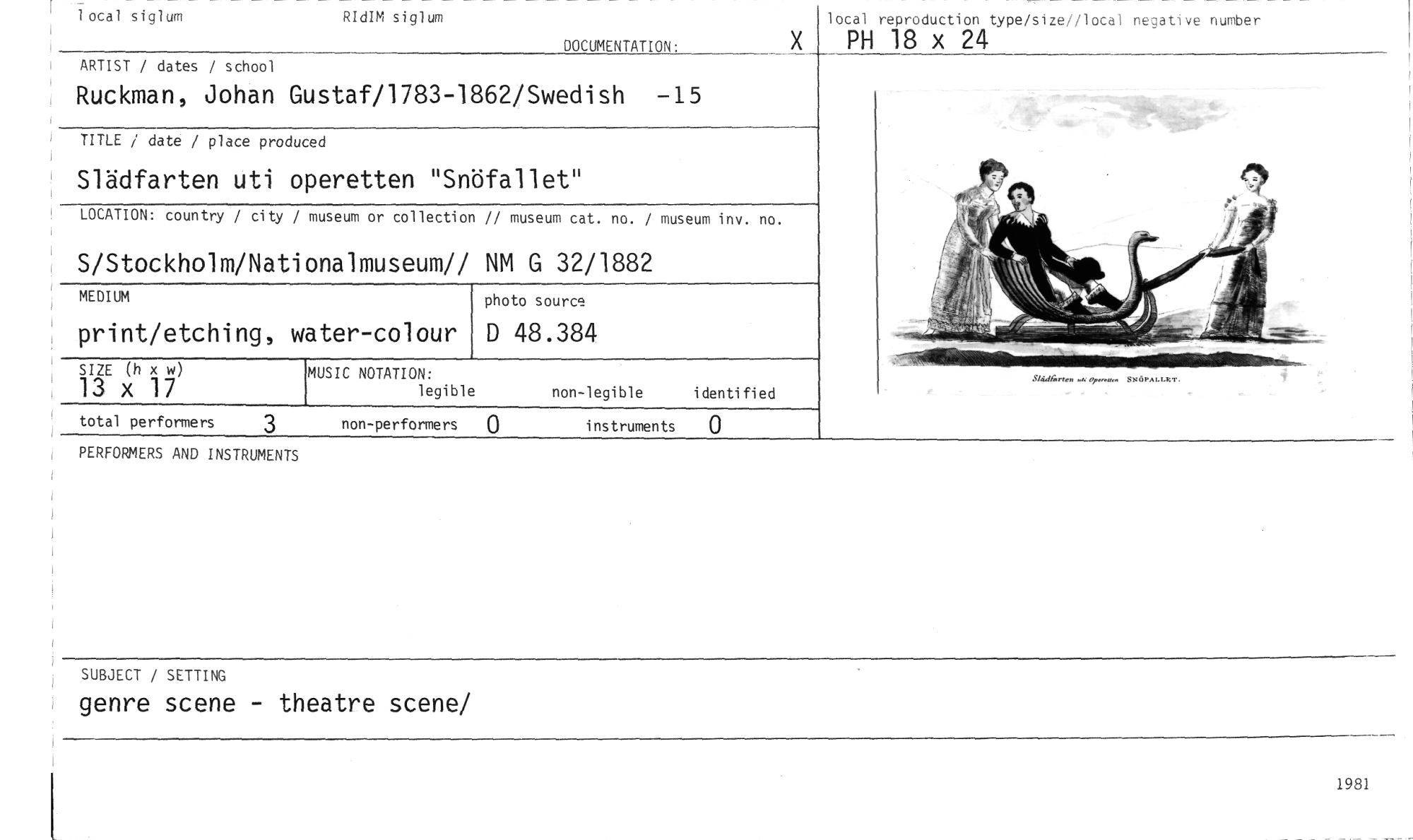 //// local siglum //// RIdIM siglum //// DOCUMENTATION: //// local reproduction type/size//local negative number //// PH 18 x 24 //// ARTIST / dates / school //// Ruckman, Johan Gustaf/1783-1862/Swedish -15 //// TITLE / date / place produced //// Slädfarten uti operetten "Snöfallet" //// LOCATION: country / city / museum or collection // museum cat. no. / museum inv. no. //// S/Stockholm/Nationalmuseum// NM G 32/1882 //// photo sourcu //// D 48.384 //// SIZE (h x w) //// 13 x 17 //// total performers 3 non-performers instruments 0 //// MEDIUM //// print/etching, water-colour //// MUSIC NOTATION: //// legible non-legible identified //// PERFORMERS AND INSTRUMENTS //// SUBJECT / SETTING //// genre scene - theatre scene/ //// 1981 ////