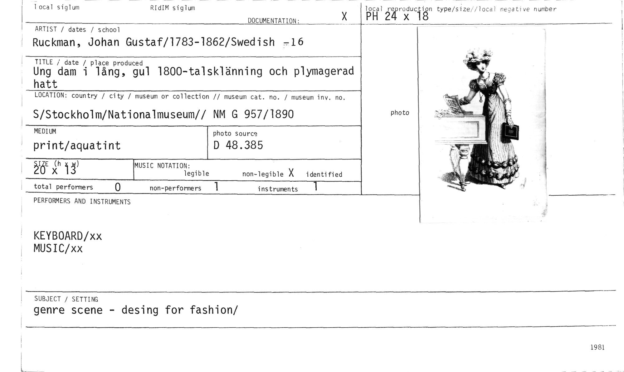 //// 14f12hdcuciign type/s ze// local negative number //// local siglum RIdIM siglum //// DOCUMENTATION. //// ARTIST / dates / school //// Ruckman, Johan Gustaf/1783-1862/Swedish -16 //// TITLE / date / place produced //// Ung dam i lång, gul 1800-talsklänning och plymagerad hatt //// LOCATION: country / city / museum or collection // museum cat. no. / museum inv. no. //// S/Stockholm/Nationalmuseum// NM G 957/1890 //// photo source //// D 48.385 //// photo //// MEDIUM //// print/aquatint //// 16E )((h ä) MUSIC NOTATION: //// legible non-legible X identified //// total performers 0 non-performers 1 instruments 1 //// PERFORMERS AND INSTRUMENTS //// KEYBOARD/xx MUSIC/xx //// SUBJECT / SETTING //// genre scene - desing for fashion/ //// 1981 ////