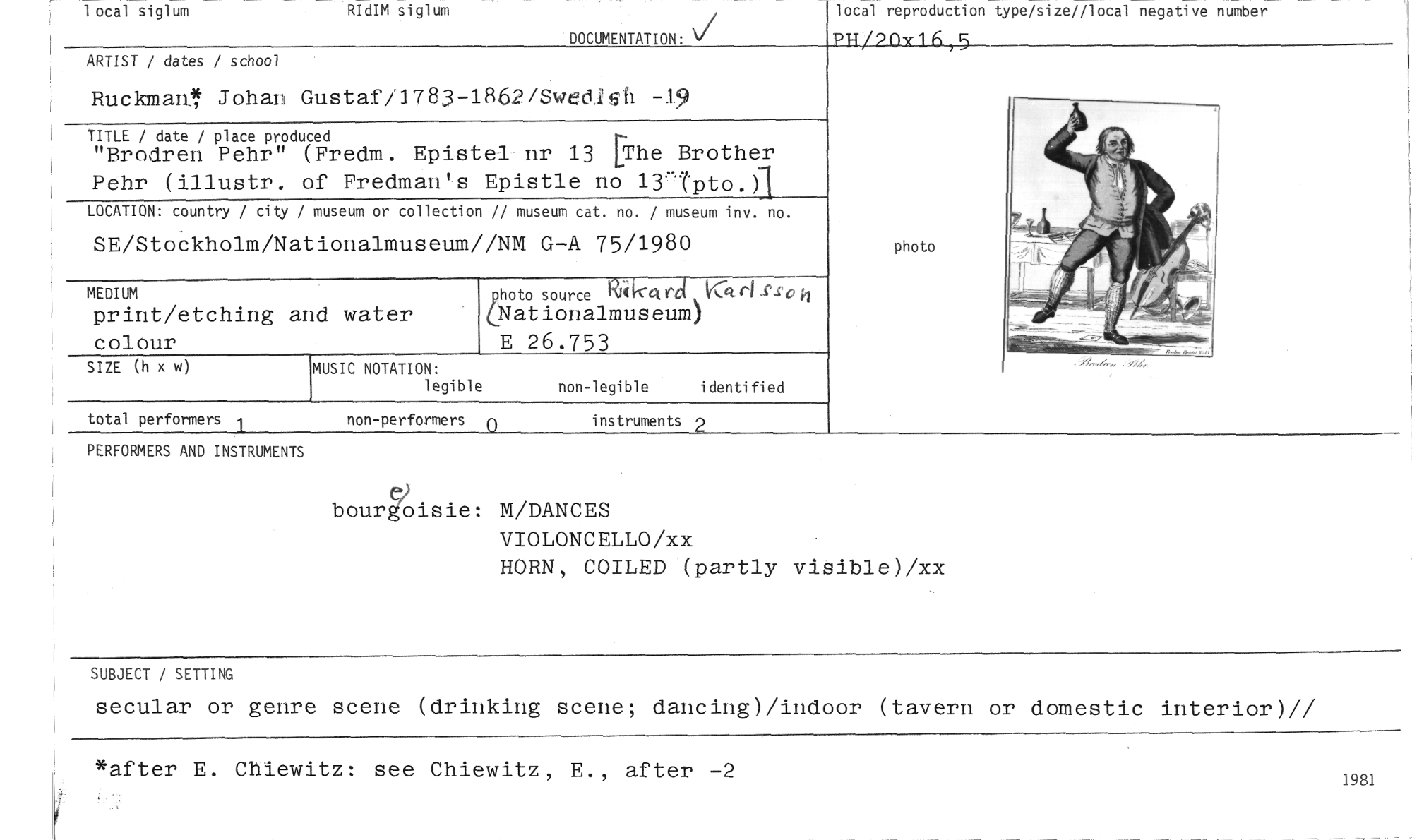 //// RIdIM siglum //// 1 ocal siglum //// DOCUMENTATION: //// SIZE (h x w) //// MEDIUM //// print/etching and water colour //// ARTIST / dates / school //// Ruckman, Johan Gustaf/1783-1862/Swedish -.19 //// TITLE / date / place produced //// "Broåren Pehr" (Fredm. Epistel nr 13 [The Brother //// Pehr (illustr. of Fredman's Epistle no 1rTpto.)1 //// LOCATION: country / city / museum or collection // museum cat. no. / museum inv. no. //// SE/Stockholm/Nationalmuseum//NM G-A 75/1980 //// photo source Rikard Ketri.croh //// (Nationalmuseum) E 26.753 //// MUSIC NOTATION: //// legible non-legible identified //// photo //// instruments 2 //// non-performers o //// total performers 1 //// 1981 //// *after E. Chiewitz: see Chiewitz, E., after -2 //// local reproduction type/size//local negative nurober //// PH/20X16 5 //// PERFORMERS AND INSTRUMENTS //// bour oisie: M/DANCES //// VIOLONCELLO/xx //// HORN, COILED (partly visible)/xx //// SUBJECT / SETTING //// secular or genre scene (drinking scene; dancing)/indoor (tavern or domestic interior)// ////