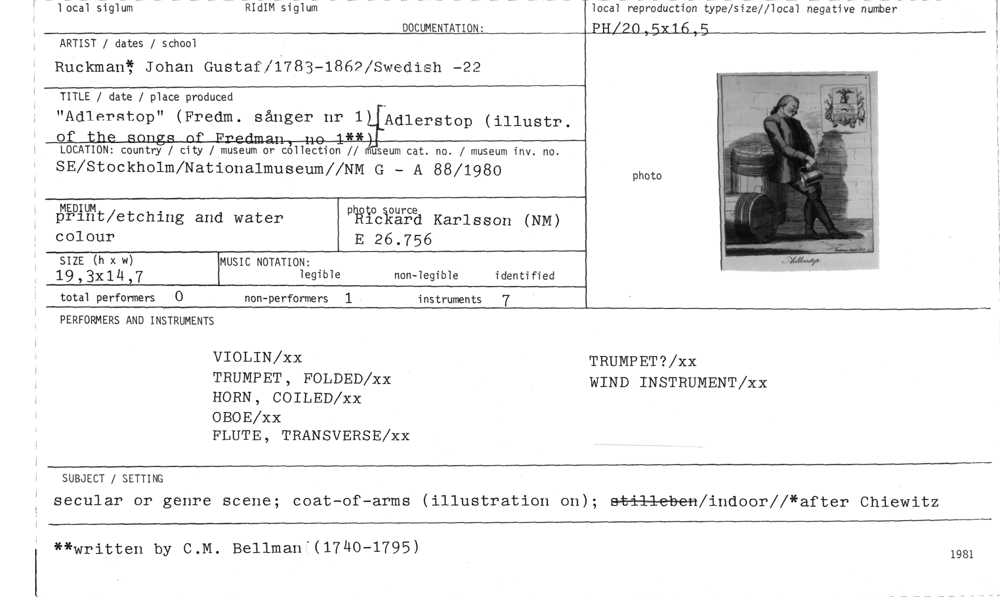 //// 1 ocal siglum RIdIM siglum //// DOCUMENTATION: //// lotal reproduction type/size//local negative number //// PH/20 ,5x16,5 //// ARTIST / dates / school //// Ruckmanl Johan Gustaf/1783-1862/Swedish -22 //// TITLE / date / place produced //// "Adlerstop" (Fredm. sånger nr 1 )rfAdlerstop ( illustr . //// of the song nf Fredmnn, no 1**) //// LOCATION: country / city / museum or collection 7/ IISKR cat. no. / museumlinv. no. //// SE/Stockholm/Nationalmuseum//NM G - A 88/1980 //// Pli4TMA Karlsson (NM) E 26.756 //// SIZE (h x w) 19,3X14,7 //// rum um //// print/etching and water //// colour //// MUSIC NOTATION: //// legible non-legible i denti fi ed //// photo //// total performers 0 non-performers 1 instruments 7 //// PERFORMERS AND INSTRUMENTS TRUMPET?/xx //// VIOLIN/xx WIND INSTRUMENT/xx //// TRUMPET, FOLDED/xx HORN, COILED/xx //// OBOE/xx //// FLUTE, TRANSVERSE/xx //// SUBJECT / SETTING //// secular or genre scene; coat-of-arms (illustration on); otillcben/indoor//*after Chiewitz //// "written by C.M. Bellman"(1740-1795) 1981 ////