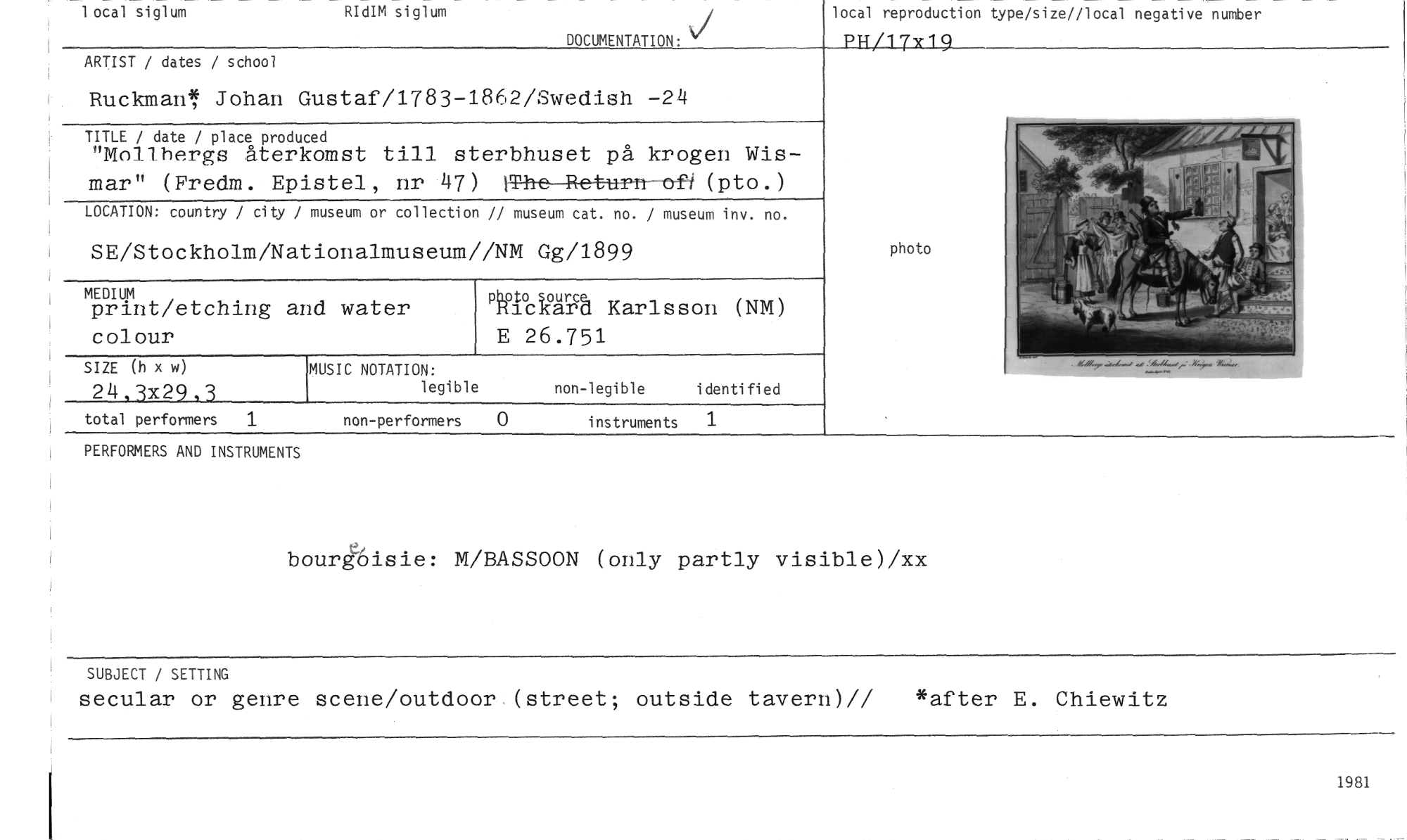 //// 1 ocal siglum RIdIM siglum //// DOCUMENTATION: //// local reproduction type/size//local negative number //// PII/1 7x 1 9 //// ARTIST / dates / school //// Ruckman, Johan Gustaf/1783-1862/Swedish -24 //// TITLE / date / place produced //// "Mollbergs återkomst till sterbhuset på krogen Wismar" (Fredm. Epistel, nr 47) iThc Return rrf-f(pto.) //// LOCATION: country / city / museum or collection // museum cat. no. / museum inv. no. //// SE/Stockholm/Nationalmuseum//NM Gg/1899 //// PecVagå Karlsson (NM) E 26.751 //// SIZE x w) //// 24,3x29,3 //// total performers 1 non-performers 0 instruments 1 //// PERFORMERS AND INSTRUMENTS //// MEDIUM //// print/etching and water colour //// MUSIC NOTATION: //// legible non-legible identified //// photo //// bourbisie: M/BASSOON (only partly visible)/xx //// SUBJECT / SETTING //// secular or genre scene/outdoor.(street; outside tavern)// *arter E. Chiewitz //// 1981 ////