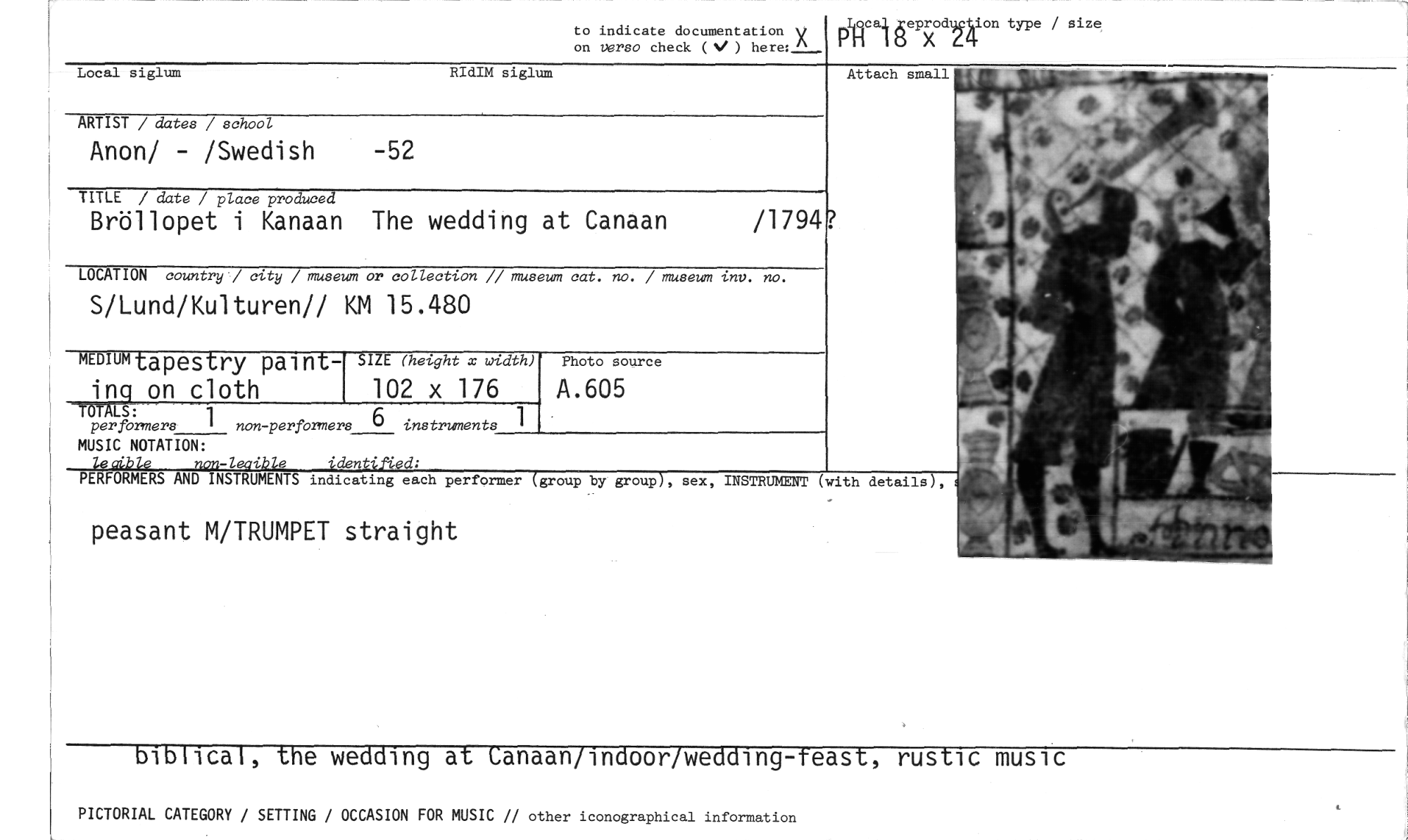 //// biblical, the wedding at Lanaan/indoor/wedding-tealt, rustic music //// PICTORIAL CATEGORY / SETTING / OCCASION FOR MUSIC // other iconographical information //// to indicate documentation v //// on verso check ( V ) here: A //// Local siglum RIdIM siglum //// ARTIST / dates / school //// Anon/ - /Swedish -52 //// TITLE / date / place produced //// Bröllopet i Kanaan The wedding at Canaan /1794 //// LOCATION country / city / museum or collection // museum cat. no. / museum inv. no. //// S/Lund/Kulturen// KM 15.480 //// pIncai åepkodhion type / size //// Attach small //// MEDIUM tapestry pai nt-T SIZE (height x width) //// ing on cloth 102 x 176 //// Pilot() source //// A.605 //// TETALS: //// per formers 1 non-perfermers 6 instruments //// MUSIC NOTATION: //// lecible nnn-leaible identified; //// PERFORMERS AND INSTRUMENTS //// indicating each performer by sex, INSTRUMENT (with details), //// peasant M/TRUMPET straight ////