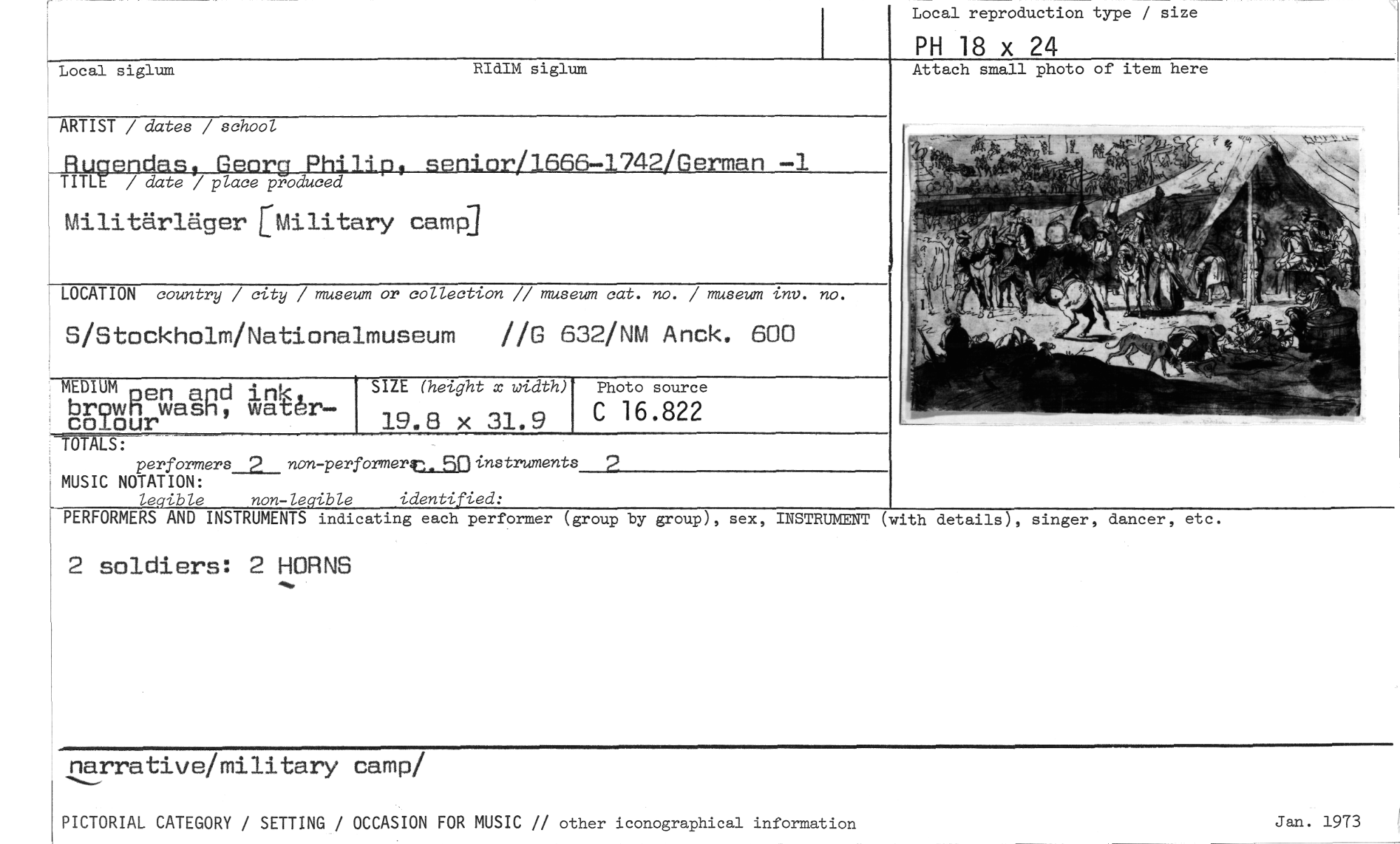//// Photo source //// C 16.822 //// SIZE (height x width) //// 19.8 x 31.9 //// Local reproduction type / size //// PH 18 x 24 //// Local siglum RIdIM siglum //// ARTIST / dates / school //// Rugendas, Georg Philip, senior/1666-1742/German —1 TITLE / date / place produced //// Militärläger [Military cannj //// LOCATION country / city / museum or collection // museum cat. no. / museum inv. no. //// S/Stockholm/Nationalmuseum //G 632/NM Anck. 600 //// MEDIUM enand ink //// brown wasn, watår— co lour //// OT TÅLS: //// P //// performers 2 non-performerr. FK1 instruments MUSIC NOTATION: //// legible non-legible identified: //// PERFORMERS AND INSTRUMENTS indicating each performer (group by group), sex, INSTRUMENT (with details), singer, dancer, etc. //// 2 soldiets: 2 HORNS //// Attach small photo of item here //// narrative/military camp/ //// PICTORIAL CATEGORY / SETTING / OCCASION FOR MUSIC // other iconographical information Jan. 1973 ////