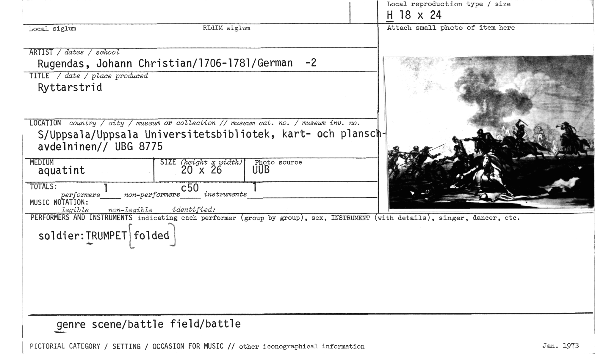 //// genre scene/battle field/battle //// PICTORIAL CATEGORY / SETTING / OCCASION FOR MUSIC // other iconographical information //// Jan. 1973 //// MUSIC NOTATION: //// Legible non-legible identified: //// PERFORMERS AND INSTRUMENTS indicating each performer (group //// by group), sex, INSTRUMENT (with details), singer, dancer, etc. //// Local reproduction type / size //// H 18 x 24 //// Local siglum RIdIM siglum //// Attach small photo of it em here //// ARTIST / dates / school //// Rugendas, Johann Christian/1706-1781/German -2 //// TITLE / date / place produced //// Ryttarstrid //// LOCATION country / city / museum or collection // museum cat. no. / museum inv. no. //// S/Uppsala/Uppsala Universitetsbibliotek, kart- och planschavdelninen// UBG 8775 //// MEDIUM //// aquatint //// soldier:TRUMPET folded //// 1 //// performers non-parformersc50 instruments 1 //// SIZE (height x width) //// 20 x 26 //// Photo source //// UUB ////