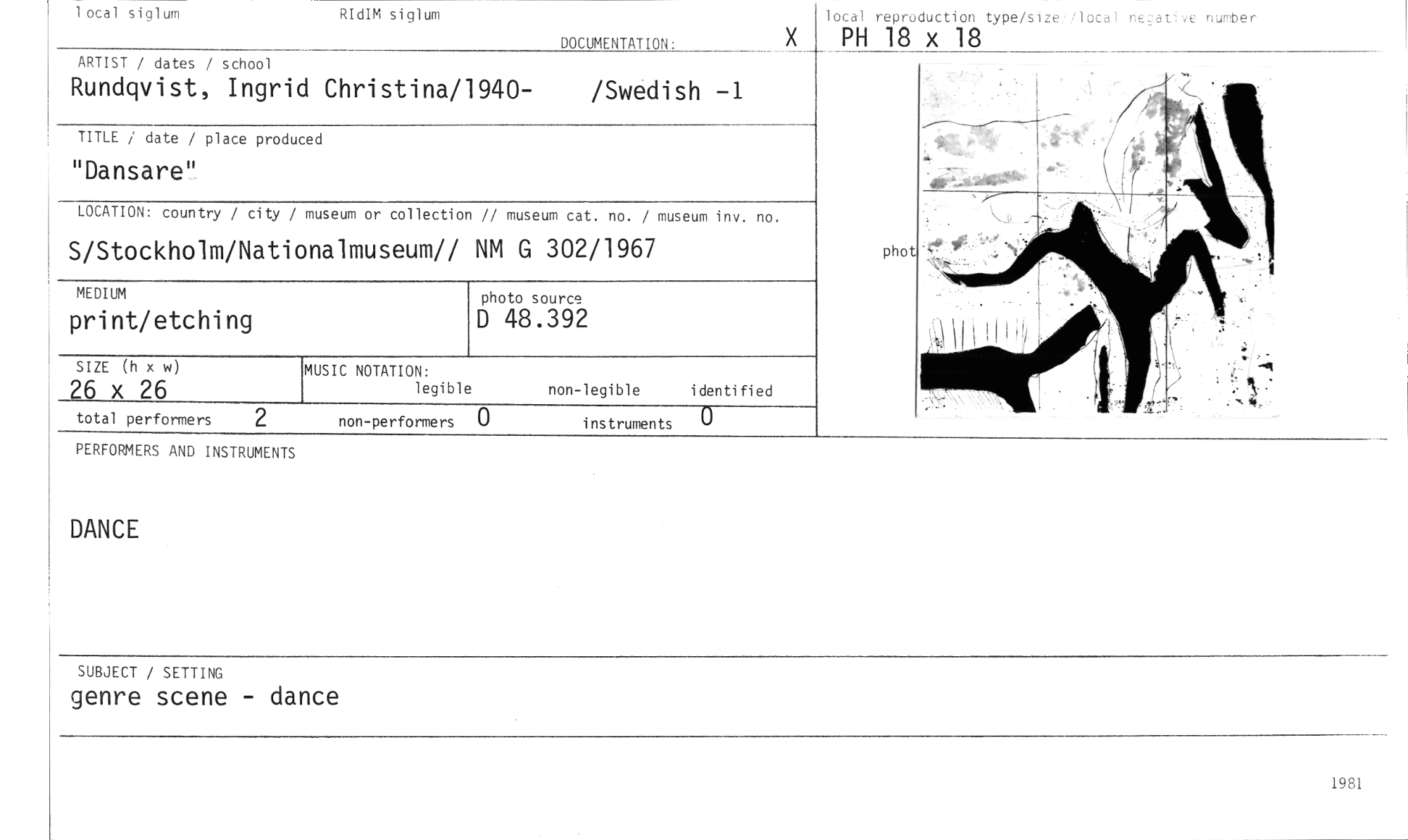 //// lotal reproduction type/size local nE.*jve. number //// PH 18 x 18 //// DOCUMENTATION: //// lotal siglum RIdIM siglum //// ARTIST / dates / school //// Rundqvist, Ingrid Christina/1940- //// /Swedish -1 //// TITLE / date / place produced //// "Dansare //// LOCATION: country / city / museum or collection // museum cat. no. / museum inv. no. //// S/Stockholm/Nationalmuseum// NM G 302/1967 //// pho //// MEDIUM //// print/etching //// photo source //// D 48.392 //// MUSIC NOTATION: //// legible //// SIZE (h x w) //// 26 x 26 //// non-legible identified //// total performers 2 //// non-performers 0 instruments 0 //// PERFORMERS AND INSTRUMENTS //// DANCE //// SUBJECT / SETTING //// genre scene - dance //// 1981 ////