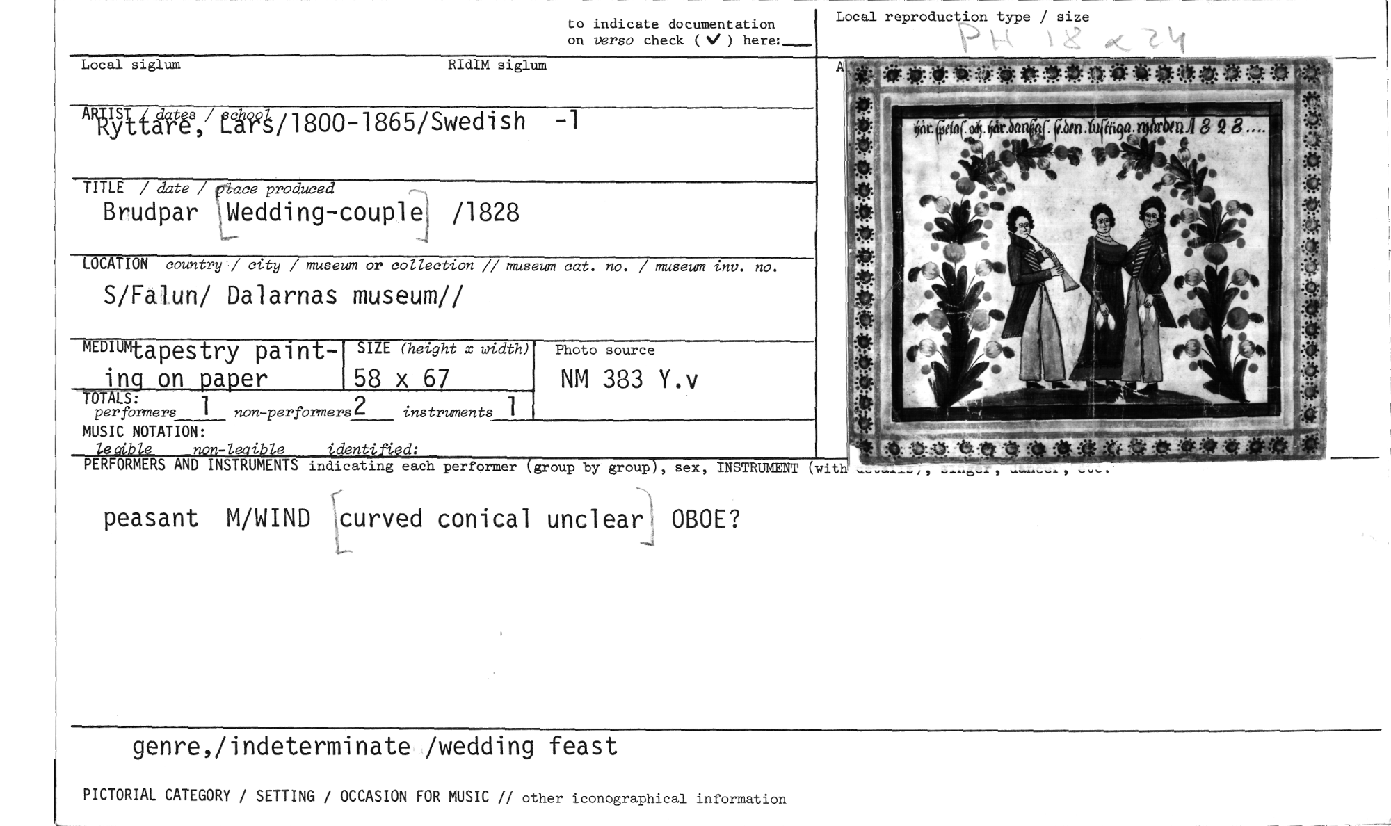 //// to indicate documentation Local reproduction type / size //// on versa check (N/ ) here: -- //// Local siglum RIdIM siglum //// AWAigage,/ Elfå / 1800-1865/Swedish -1 //// TITLE / date / place produced //// Brudpar lyedding-couple /1828 //// LOCATION country / city / museum or collection // museum cat. no. / museum inv. no. //// S/Falun/ Dalarnas museum// //// MEDIU SIZE (hevght x width) //// "' //// -Lapestry paint- //// ing on paper 58 x 67 //// TÖTALS: //// per formers 1 non-performers2 instruments 1 //// MUSIC NOTATION: //// 41•e 'tient' ed: //// PERFORMERS AND INSTRUMENTS indicating each performer group by group), sex, INSTRUMENT //// peasant M/WIND \curved conical unclearl OBOE? //// -4 //// genre,/indeterminate /wedding feast //// PICTORIAL CATEGORY / SETTING / OCCASION FOR MUSIC // other iconographical information //// Photo source //// NM 383 Y.v ////