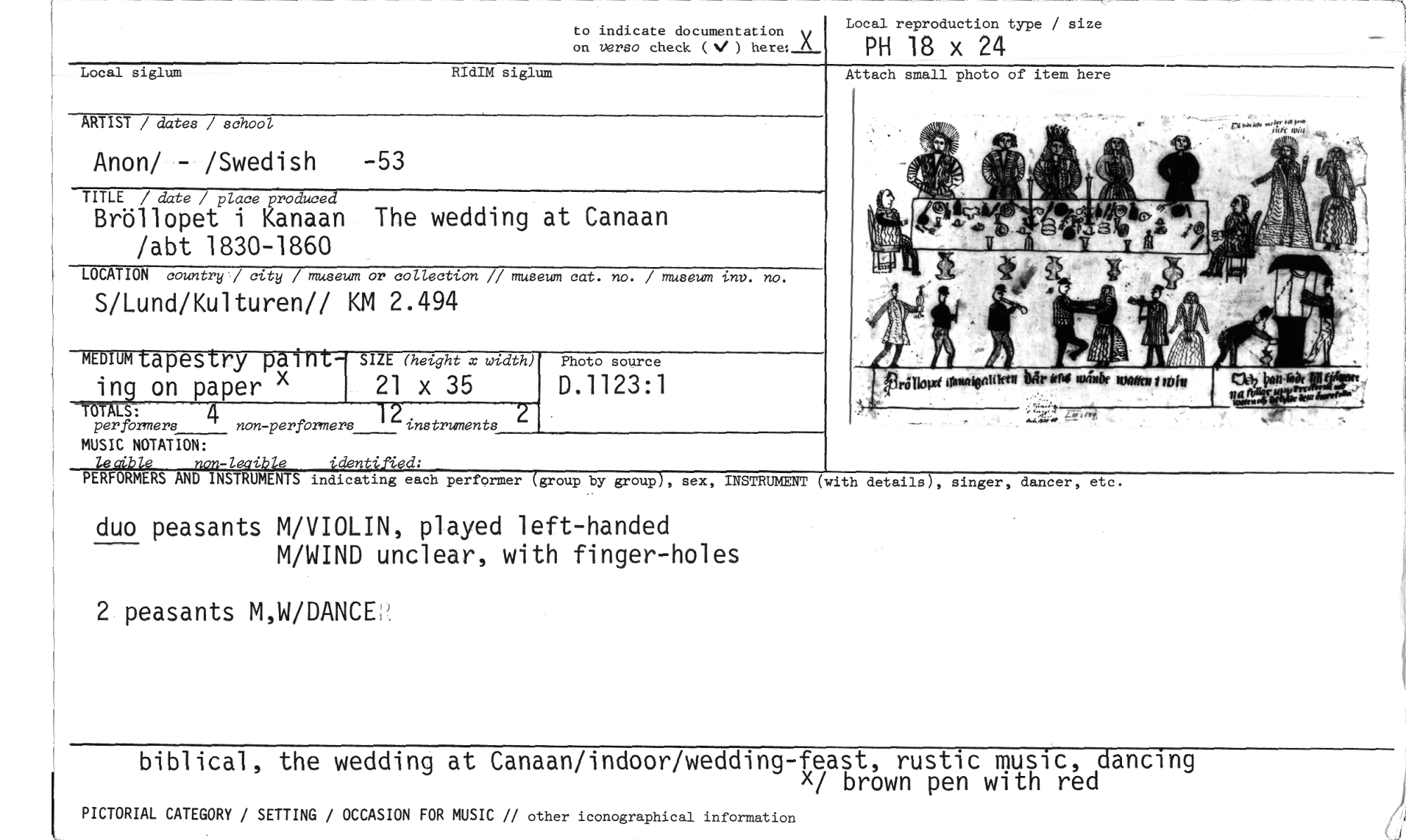 //// to indicate documentation v //// Local reproduction type / size //// on versa check (N/ ) here—/-1- PH 18 x 24 //// duo peasants M/VIOLIN, played left-handed M/WIND unclear, with finger-holes //// 2 peasants KW/DANCE' //// biblical, the wedding at Canaan/indoor/wedding-feast, rustic music, cfancing //// x/ brown pen with red //// PICTORIAL CATEGORY / SETTING / OCCASION FOR MUSIC // other iconographical information //// Attach small photo of it em here //// (with //// details), //// RIdIM siglum //// Local siglum //// ARTIST / dates / school //// Anon/ - /Swedish -53 //// TITLE / date / placeproduced //// Bröllopet i Kanaan The wedding at Canaan /abt 1830-1860 //// LOCATION country / city / museum or collection /7 museum cat. no. / museum inv. no. //// S/Lund/Kulturen// KM 2.494 //// MEDIUMtapestry paintin•on paper x //// T IS: //// per formers non-perförmers instruments //// MUSIC NOTATION: //// leaible non-leaible identified: //// I ' //// SIZE (height x width) //// 21 x 35 //// Photo source //// D.1123:1 //// PERFORMERS AND INSTRUMENTS indicating each performer (group by group), sex, INSTRUMENT //// singer, dancer, etc. ////