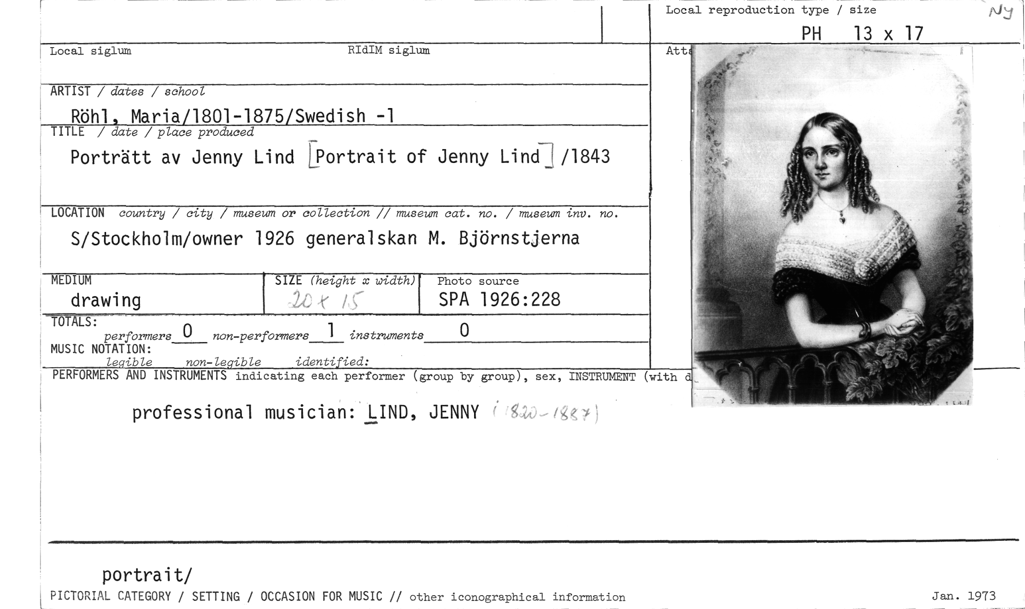 //// Local reproduction type / size //// PH 13 x 17 //// Local siglum RIdIM siglum //// Att //// ARTIST / dates / school //// Röhl, Maria/1801-1875/Swedish -1 //// TITLE / date / place produced //// Porträtt av Jenny Lind [Portrait of Jenny Lindi /1843 //// LOCATION country / city / museum or collection // museum cat. no. / museum inv. no. //// S/Stockholm/owner 1926 generalskan M. 8jörnstjerna //// -TOTALS: //// performers 0 //// MUSIC NOTATION: //// legible non-legible identified: //// PERFORMERS AND INSTRUMENTS indicating each performer (group by group), sex, INSTRUMENT (with d //// 0 //// 1 //// non-performers //// instruments //// professional musician: LIND, JENNY /S4,0—iggl) //// portrait/ //// PICTORIAL CATEGORY / SETTING / OCCASION FOR MUSIC // other iconographical information //// Jan. 1973 //// MEDIUM //// drawing //// Photo source //// SPA 1926:228 //// SIZE (height x width) //// ze [(,-- ////