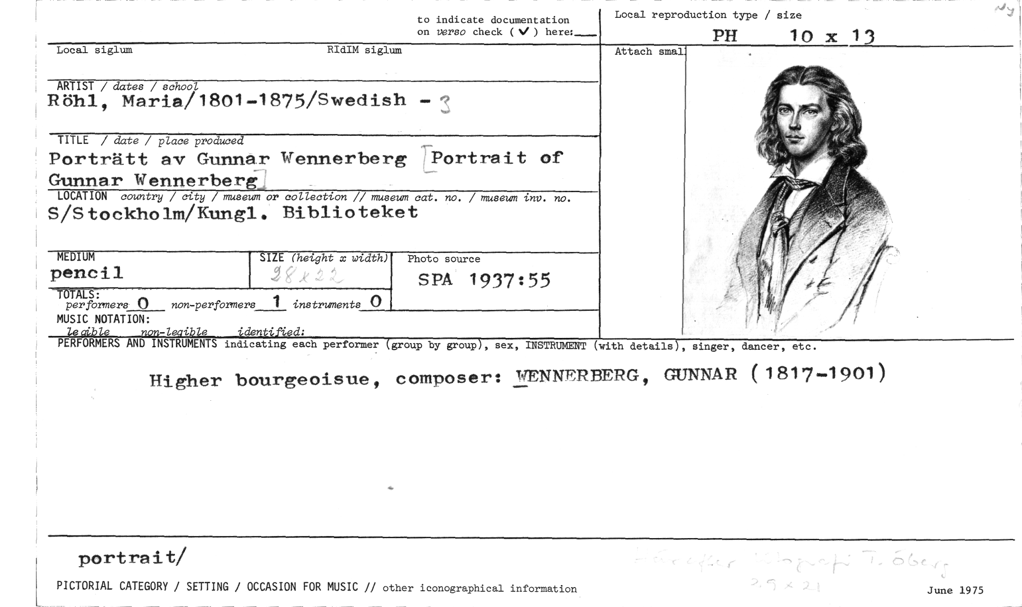 //// to indicate documentation //// on verso check ( ) here: //// Local siglum RIdIM siglum //// Local reproduction type / size //// PH 10 x 15 //// Attach smal //// ARTIST / dates / school //// Röhl, Maria/1801-1875/Swedish - //// TITLE / date / place produced //// Porträtt av Gunnar Wennerberg Portrait of //// Gunnar Wennerberg_ //// LOCATION country / city / museum or collection // museum cat. no. / museum inv. no. //// S/Stockholrn/Ktuigl. Biblioteket //// SIZE (height x width) //// TALS: //// per formers 0 non-performers 1 instruments //// MUSIC NOTATION: //// le6ible idntified; //// PERFORMERS AND INSTRUMENTS indicating each performer (group by group), sex, INSTRUMENT //// (with details), singer, dancer, etc. //// MEDIUM pencil //// Photo source //// SPÄ 1937:55 //// Higher bourgeoisue, composer: WENNERBERG, GUNNAR ( 1817-1901) //// portrait/ //// PICTORIAL CATEGORY / SETTING / OCCASION FOR MUSIC // other iconographical information June 1975 ////