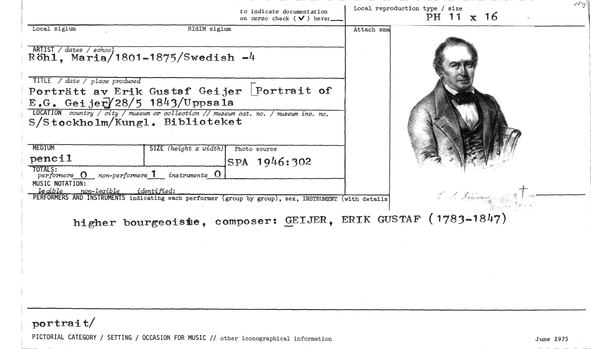 //// to indicate documentation //// on verso check (V ) here:_ //// Local reproduction type / size //// PH 11 x 16 //// Local siglum RIdIM siglum //// Attach sma //// t //// ARTIST / dates / schoo //// Röhl, Maria/1801-1875/Swedish -4 //// TITLE / date / place produced //// Porträtt av Erik Gustaf Geijer Yortrait of E,G. GeijeiY28/5 1843/Uppsala. //// LOCATION country / city / museum or collection // museum cat. no. / museum inv. no. //// S/Stockholm/Kungl. Biblioteket //// SIZE (heiyht x zotdth) //// TUMS: //// per formers 0 non-performers 1 instruments 0 MUSIC NOTATION: //// Ifcibie non-leaible identified: //// PERFORMERS AND INSTRUMENTS indicating each performer (group by group), sex, INSTRUMENT (with details //// higher bourgeoiste, composer: GEIJER, ERIK GUSTAF (1783-1847) //// MEDIUM //// pencil //// Photo source //// SPA 1946:302 //// portrait/ //// PICTORIAL CATEGORY / SETTING / OCCASION FOR MUSIC // other iconographical information June 1975 ////