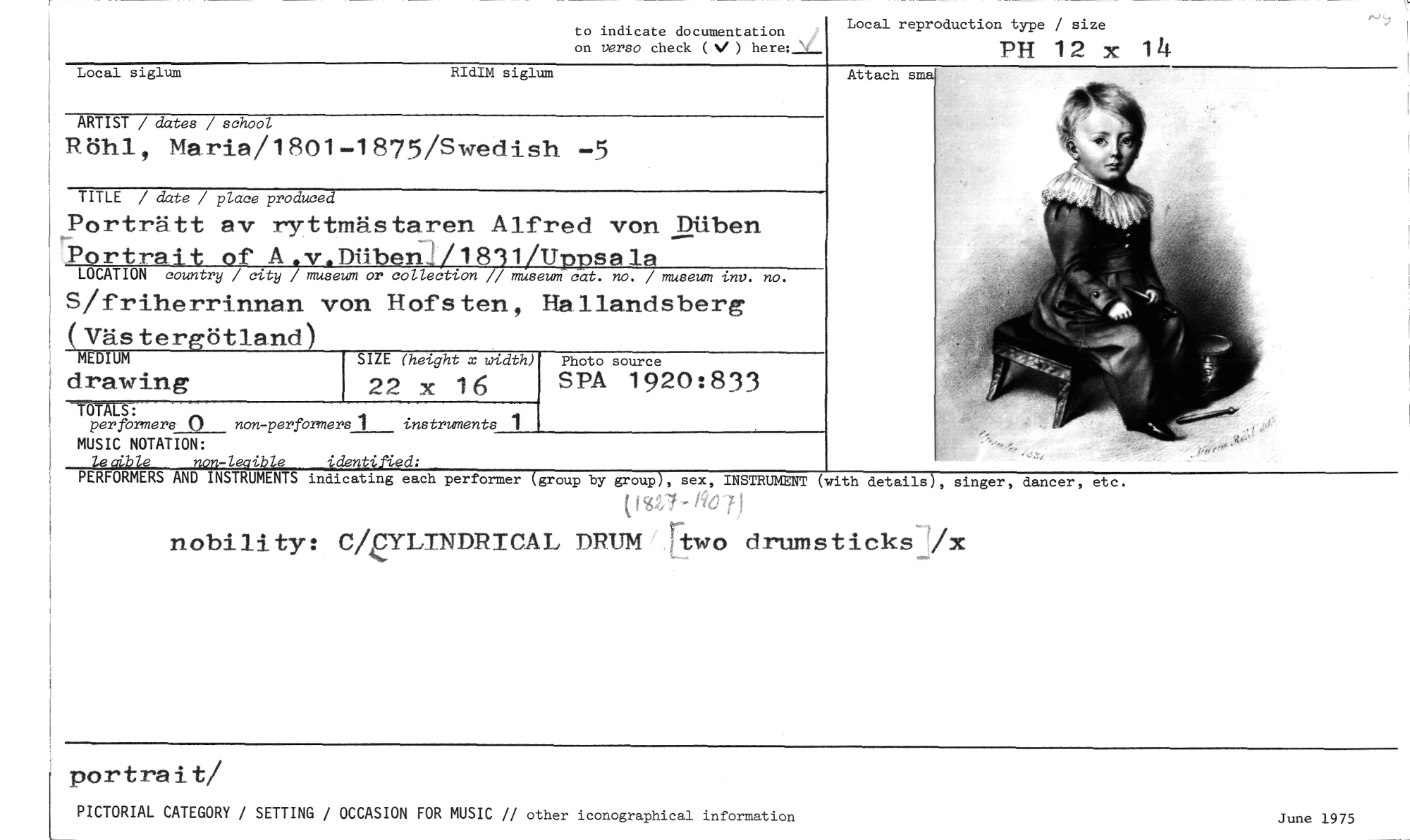 //// to indicate documentation on versa check (N/ ) //// Local reproduction type / size //// PH 12 x 1 //// Local siglum RIdIM siglum //// ARTIST / dates / school //// R öhl , Maria/1801-1875/Swedish -5 //// TITLE / date / place produced //// Porträtt av ryttmästaren Alfred von DUben //// , , //// ,Portrai.t of A .v. Diiben2/ 1831/Uppse la //// LOCATION country / city / museum or collection // museum dat. no. / museum inv. no. //// S/friherrinnan von Hofs ten, Ha llandsberg //// ( Västergötland) //// Photo source //// SPA 1920:833 //// TOTALS: //// per formers () non-performers 1 instruments 1 //// MUSIC NOTATION: //// le aible non-legible identified; //// drawing 22 x 16 //// MEDIUM SIZE (height x width) //// Attach sm //// PERFORMERS AND INSTRUMENTS indicating each performer (group by group), sex, INSTRUMENT (with details), singer, dancer, etc. //// (1%,7 -1,6 7') • r //// n obi li ty: C/YLINDPICAL DRUM ' Ltwo drumsticks //// /x //// portrait/ //// PICTORIAL CATEGORY / SETTING / OCCASION FOR MUSIC // other iconographical information //// June 1975 ////