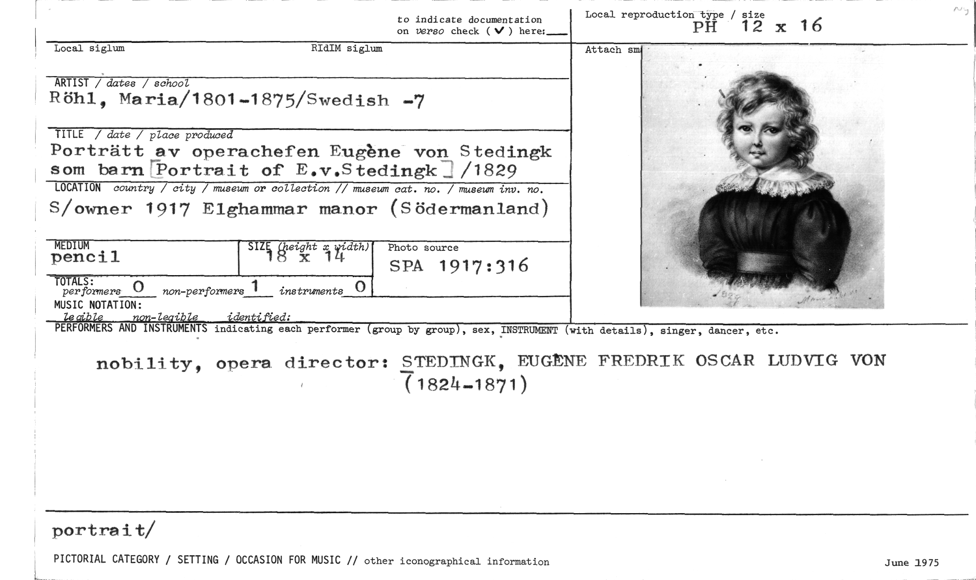 //// to indicate documentation //// on verso check (V) here:- //// Local reproduction type / size //// PH 12 x 16 //// Local siglum RIdIM siglum //// Attach s //// ARTIST / dates / school //// Röhl, Maria/1801-1875/Swedish -7 //// TITLE / date / place produced //// Porträtt av operachefen Eughne von, Stedingk som barnr-Portrait of E.v.Steclingk _ /1829 //// LOCATION country / city / museum or collection // museum cat. no. / museum inv. no. //// S/owner 1917 Elghammar manor (Södermanland) //// MEDIUM //// pencil //// eT,LS: //// per formers 0 non-perfOrmers 1 instruments //// MUSIC NOTATION: //// non-leaible identified: //// PERFORMERS AND INSTRUMENTS indicating each performer (group by group), sex, INSTRUMENT (with details), singer, dancer, //// nobility, opera director: STEDINGK, EUGtNE FREDRIK OSCAR LUDVIG VON //// 71824-1871) //// portrait/ June 1975 //// PICTORIAL CATEGORY / SETTING / OCCASION FOR MUSIC // other iconographical information //// SIZEUri (height x wridth) //// i 4 //// 0 //// Photo source //// SPA 1917:316 //// etc. //// L ////