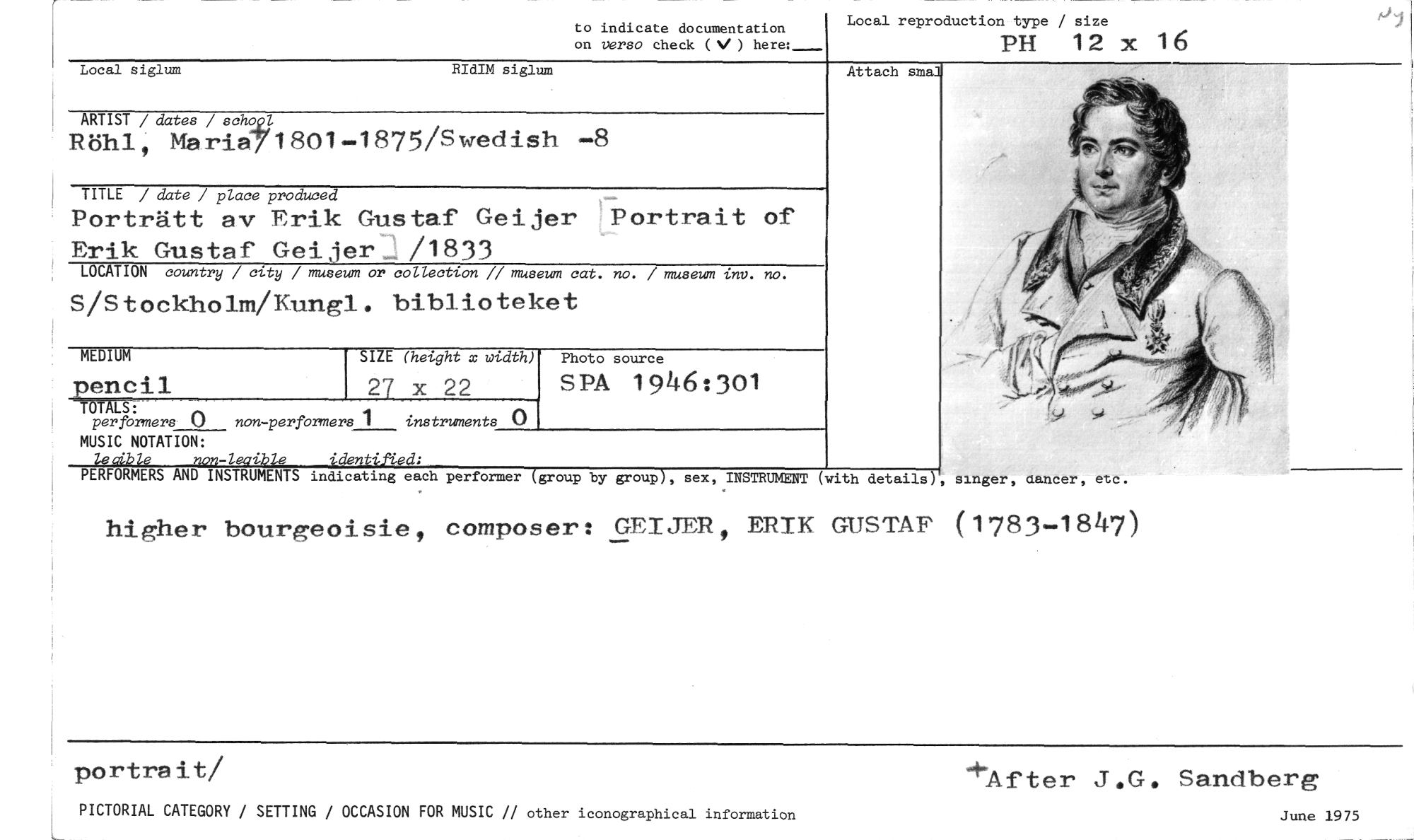 //// to indicate documentation on versa check ( ) here: //// Local siglum RIdIM siglum //// ARTIST / dates / schopl //// Röhl, Maria71801-1875/Swedish -8 //// TITLE / date / place produced //// Porträtt av Erik Gustaf Geijer Portrait of //// Erik Gustaf Geijer_ /1833 //// LOCATION country / city / museum or collection // museum cat. no. / museum inr. no. //// S/Stockholm/Kungl. biblioteket //// MEDIUM SIZE (heught x width) Photo //// enöm 27 x 22 SPA //// LS: non-perfoneers 1 instruments () //// per formers () //// MUSIC NOTATION: //// leaible non-lmaibie identifed; //// PERFORMERS AND INSTRUMENTS indicating each performer (group by group), sex, INSTRUMENT //// Local reproduction type / size //// PH 12 x 16 //// (with details), singer, cancer, etc. //// Attach smal //// source //// 1946:301 //// higher bourgeoisie, composer: GEIJER, ERIK GUSTAF (1783-1847) //// portrait/ +After J.G. Sandberg //// PICTORIAL CATEGORY / SETTING / OCCASION FOR MUSIC // other iconographical information June 1975 ////