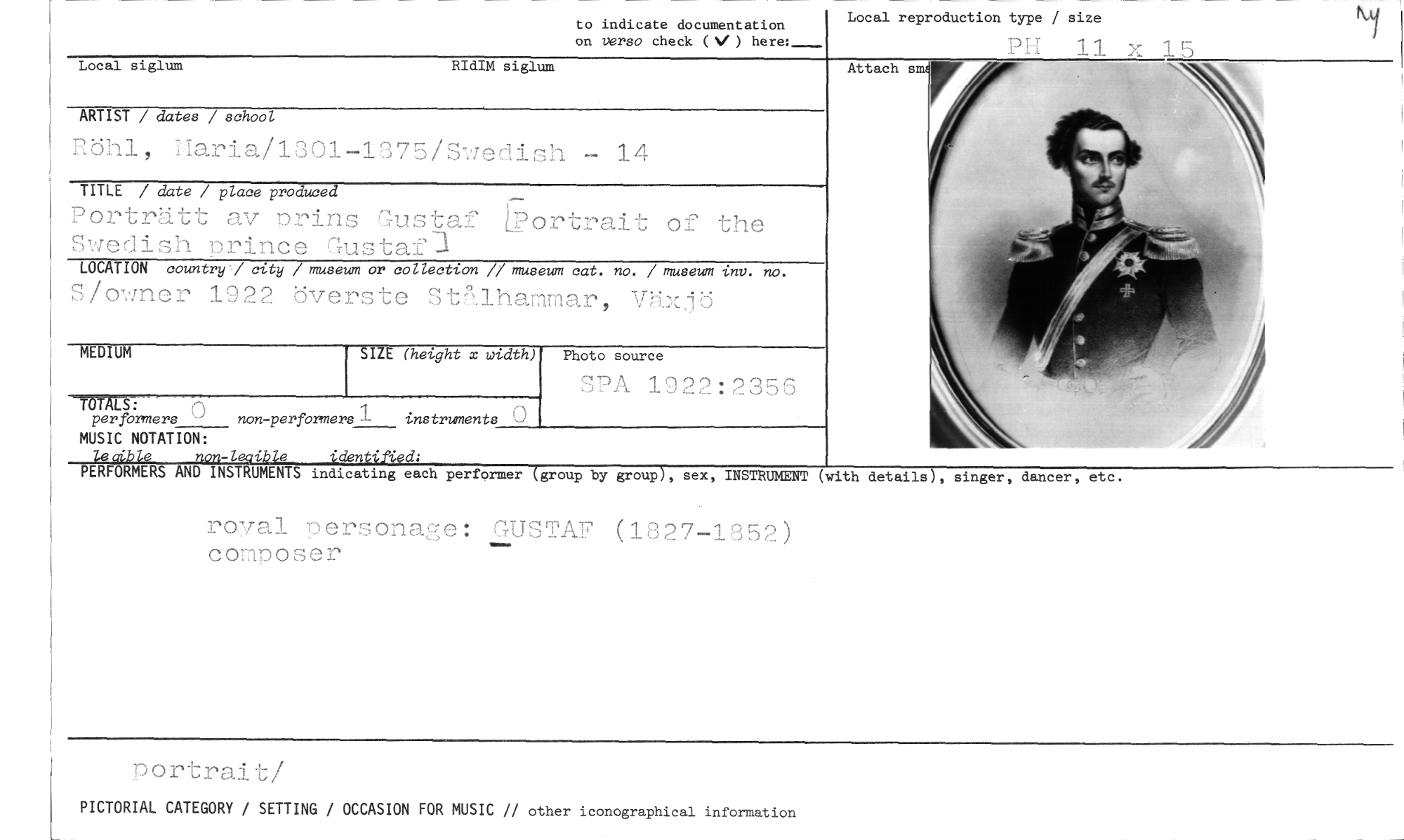 //// siglum RIdIM siglum //// ARTIST / dates / school //// Röhl, Maria/1301-1375/Swedish - 14 //// TITLE / date / place produced //// Porträtt av prins Gustaf LPortrait of the Swedish prince Gustaf-2 //// LOCATION country,/ city / museum or collection // museum cat. no. / museum inv. no. //// S/owner 1922 överste Stlhammar, Växjö //// MEDIUM //// SIZE (height x width) //// to indicate documentation //// on verso check (V ) here: //// Photo source //// Local reproduction type / size //// 7)- 1 //// Attach //// SPA 1022:2356 //// 7131717F //// performers non-perfbrmers 1 instruments L //// MUSIC NOTATION: //// Zecible non-legible identifYed: //// PERFORMERS AND INSTRUMENTS indicating each performer (group by group), sex, INSTRUMENT (with detailaY, ringer, dancer, etc. //// royal personage: GUSTAF (1827-1852) composer //// nortrait/ //// PICTORIAL CATEGORY / SETTING / OCCASION FOR MUSIC // other iconographical information ////