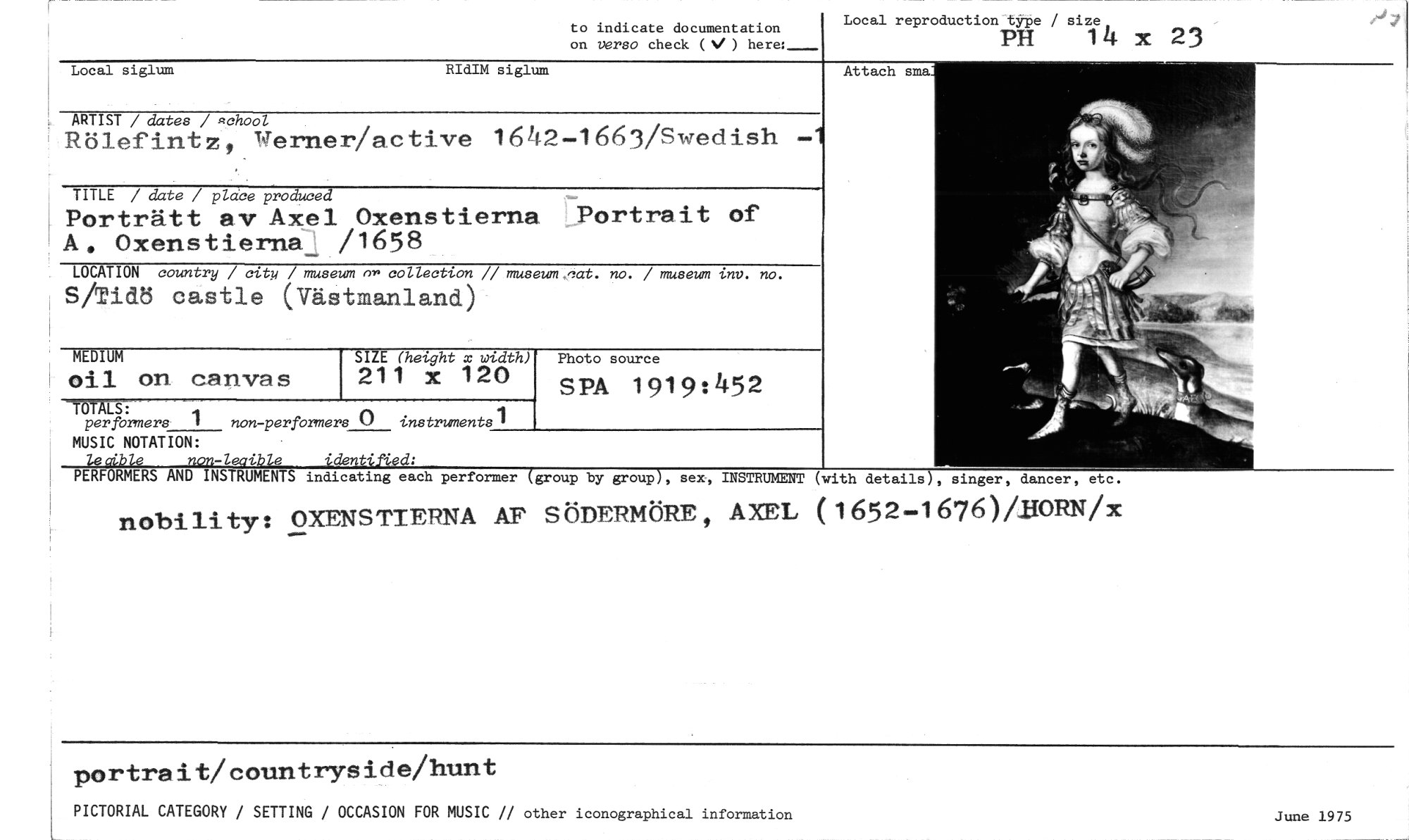 //// portrait/countryside/hunt //// PICTORIAL CATEGORY / SETTING / OCCASION FOR MUSIC // other iconographical information //// June 1975 //// to indicate documentation //// on verso check (V ) here:_ //// TITLE / date / place produced //// Porträtt av Axel Oxenstierna Portrait of A. Oxenstierna /1658 //// LOCATION country / city / museum n” collection // museum,aat. no. / museum inv. no. //// S/Tidö castle (Västmanland) //// Local reproduction type / size //// PH 14 x 23 //// Attach sma //// MEDIUM //// oil on canvas //// SIZE (hetght x width) //// 211 x 120 //// Photo source //// SPÅ 1919:452 //// TOTALS: //// per formers 1 non-performers 0 instrumenvs1 //// MUSIC NOTATION: //// ieaible non-leaible identifted: //// PERFORMERS AND INSTRUMENTS indicating each performer (group by group), sex, INSTRUMENT (with details), singer, dancer, etc. //// nobility: OXENSTIERNA AF SÖDERMÖRE, AXEL (1652-1676)/BORN/x //// Local siglum RIdIM siglum //// ARTIST / dates / school //// Rölefintz, werner/active 1642-1663/Swedish -1 ////