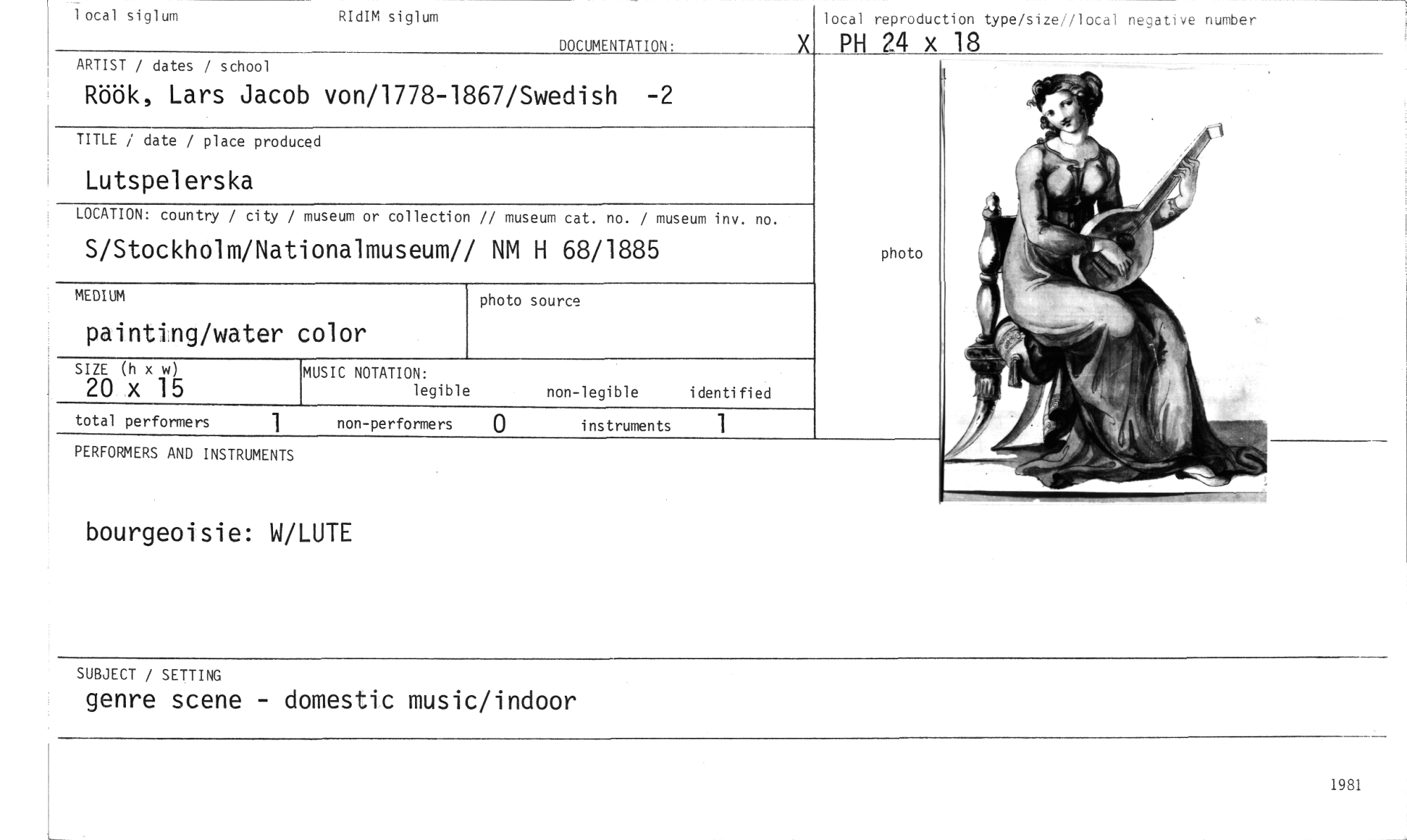 //// bourgeoisie: W/LUTE //// SUBJECT / SETTING //// genre scene - domestic music/indoor //// 1981 //// local siglum RIdIM siglum //// DOCUMENTATION: //// ARTIST / dates / school //// Röök, Lars Jacob von/1778-1867/Swedish -2 //// TITLE / date / place produced //// Lutspelerska //// LOCATION: country / city / museum or collection // museum cat. no. / museum inv. no. //// S/Stockholm/Nationalmuseum// NM H 68/1885 //// MEDIUM //// painting/water color //// local reproduction type/size local negative number //// X_ PH 24 x 18 //// photo //// SIZE (h x w) //// 20 x 15 //// total performers //// PERFORMERS AND INSTRUMENTS //// MUSIC NOTATION: //// legible //// non-performers //// non-legible identified //// instruments 1 ////
