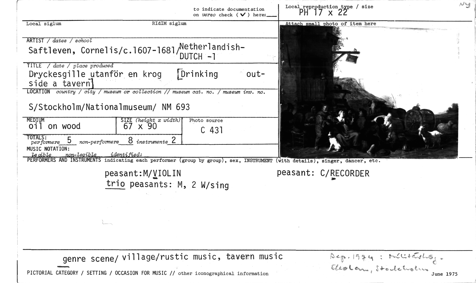 //// to indicate documentation //// on verso check (NI ) here:,_ //// Local reproduction t e / size //// PH 17 x 22 //// MEDIUM //// oil on wood //// SIZE (hetght x width) //// 67 x 90 //// Local siglum //// of item here //// RIdIM siglum //// ARTIST / dates / school //// Saftteven, Cornelis/c.1607-1681 /Netherlandish- //// DUTCH -1 //// TITLE / date / place produced //// Dryckesgille utanför en krog Drinking out- //// side a tavern //// LOCATION country / mty / museum or collection // museum cat. no. / museum mo. no. //// S/Stockholm/Nationalmuseum/ NM 693 //// —MÄLS: //// per formers 5 non-performers 8 instruments 2 //// MUSIC NOTATION: //// -/ i lent' -d: //// PERFORMERS AND INSTRUMENTS indicating each performer //// group by group , sex, INSTRUMENT (with details), singer, dancer etc. //// peasant:M/VOLIN //// trio peasants: M, 2 W/sing //// peasant: C/RECORDER //// genre scene/ villagejrustic music, tavern music //// PICTORIAL CATEGORY / SETTING / OCCASION FOR MUSIC // other iconographical information //// June 1975 ////