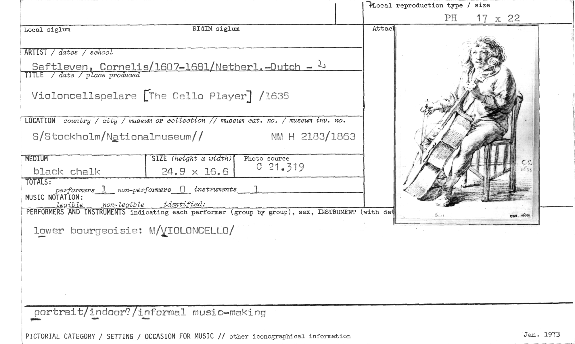//// 1Local reproduction type / size //// PH 17 x 22 //// Local siglum RIdIM siglum //// Attac //// ARTIST / dates / school //// Saftteven, Cornelis/1607-1681/Netherl.—Dutch — //// TITLE / date / place produced //// Violoncellspelare [The Cello Player] /1635 //// LOCATION country / city / museum or collection // museum cat. no. / museum inv. no. //// S/Stockholm/N2tionalmuseum// NM H 2183/1863 //// MEDIUM //// Photo source //// C 21.319 //// SIZE (height x width) //// 24.9 x 16.6 //// black chalk //// perförmers l non-performers 0 instruments 1 //// MUSIC NOTATION: //// leoible non -legible identified: //// PERFORMERS. AND INSTRUMENTS indicating each performer (group by //// group), sex, INSTRUMENT (with de //// lower bourgeoisie: mWouNcELLo/ //// portrait/indoor?/informal music—making //// PICTORIAL CATEGORY / SETTING / OCCASION FOR MUSIC // other iconographical information //// Jan. 1973 ////