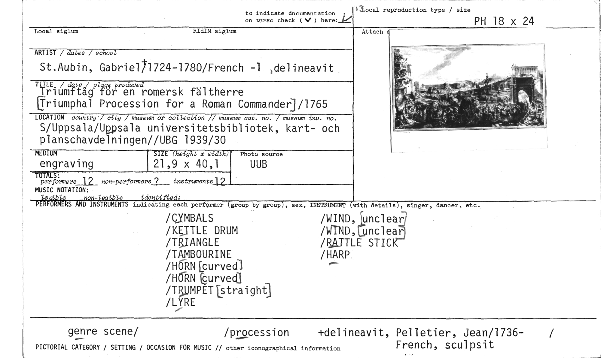 //// to indicate documentation on verso check ( ) here:_kf //// reproduction type / size //// PH 18 //// 24 //// Local siglum RIdIM siglum //// ARTIST / dates / school //// St.Aubin, GabrielYl724-1780/French -1 ,delineavit //// TITLE / date/ place produced //// Triumftag för en romersk fältherre //// [riumphal Procession for a Roman Commander]/1765 //// LOCATION country / city / museum or collection /j museum cat. no. / museum inv. no. //// S/Uppsala/Uppsala universitetsbibliotek, kart- och planschavdelningen//UBG 1939/30 //// Attach //// MEDIUM SIZE (height x width) //// engraving 21,9 x 40,1 //// -TOTALS: //// per formers 1 2 non-perfonners? instruments 12 //// Photo source //// UUB //// MUSIC NOTATION: //// le aible non-leaible identified: //// PERFORMERS AND INSTRUMENTS //// indicating each performer (group by group), sex, INSTRUMENT (with details), singer, dancer, etc. //// /KEJTLE DRUM /CYMBALS/WIND, /CYMBALS //// MIND, u nclea nclellti //// /TgAANGLE aåTTLE STIL //// /TAMBOURINE /HARI:). //// /HökNicurved7 //// /HÖN Lurved] //// /TI3UMPETLstraight] //// /LYRE //// ...- //// [ PICTORIAL CATEGORY / SETTING / OCCASION FOR MUSIC // other iconographical information French, sculpsit //// genre scene/ /procession +delineavit, Pelletier, Jean/1736- ////
