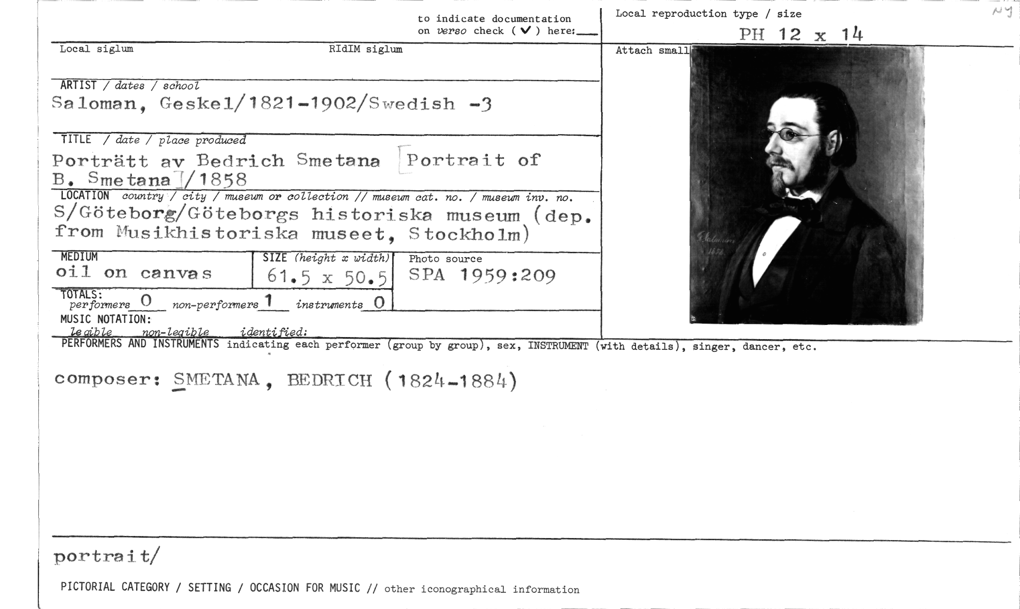 //// Local reproduction type / size //// PH 12 x 1 //// Attach smal //// to indicate documentation on verso check (tl ) //// Local siglum RIdIM siglum //// ARTIST / dater / school //// Saloman, Geske1/1821-1902/Swedish —3 //// TITLE / date / place produced //// Porträtt av Bedrich Smetana rPortrait of //// B. 7 //// LOCATION country 1city / museum or collection // museum cat. no. / museum inv. no. //// S/Götebort/Göteborgs historiska museum (dep. from Musikhistoriska museet, Stockholm) //// Photo source //// SPA 1959:209 //// composer: SMETANA, BEDRICH (1824-18S4) //// portro t/ //// MEDIUM //// oil on canvas //// TÖTALS: //// per formers () non-performers 1 instruments () //// MUSIC NOTATION: //// Z. cible non-leaibke identified: //// PERFORMERS AND INSTRUMENTS indicating each performer (group by group), sex, INSTRUMENT (with details), singer, dancer, etc. //// SIZE (height x width) //// 61.5 x 50.5 //// PICTORIAL CATEGORY / SETTING / OCCASION FOR MUSIC // other iconographical information ////