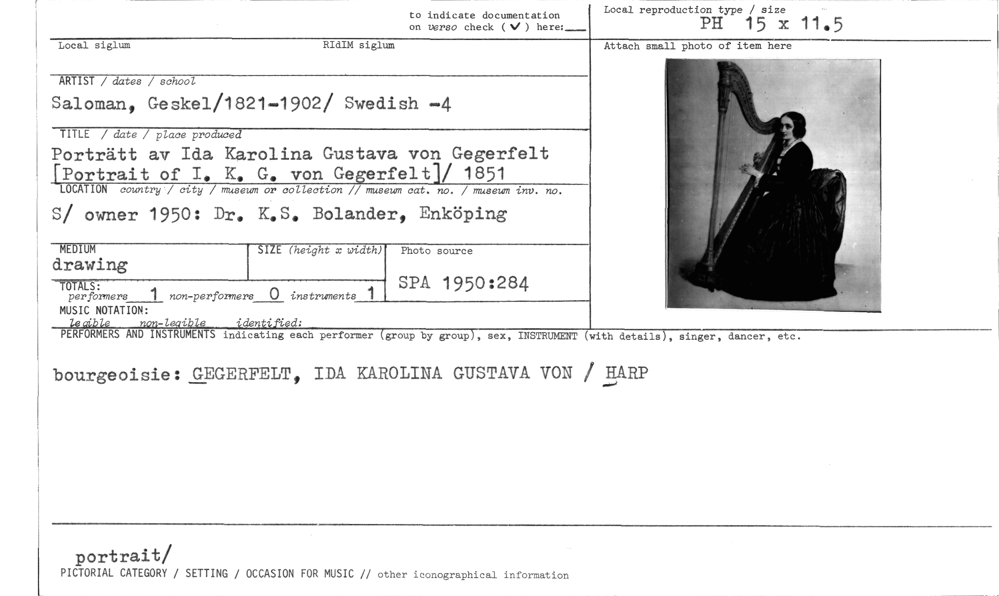 //// to indicate documentation on verso check (V ) //// Local reproduction type / size //// PH 15 x 11.5 //// Local siglum RIdIM siglum //// Attach small photo of item here //// ARTIST / dates / school //// Saloman, Geske1/1821-1902/ Swedish -4 //// TITLE / date / place produced //// Porträtt av Ida Karolina Gustava von Gegerfelt JPortrait of I. K. G. von Gegerfelt]/ 1851 //// LOCATION country / city / museum or collection // museum cat. no. / museum inv. no. //// S/ owner 1950: Dr. K.S. Bolander, Enköping //// SIZE (height x width) //// TOTALS: //// per formers 1 non-performers 0 instruments 1 //// MUSIC NOTATION: //// 4eaible non-leoibk identified; //// PERFORMERS AND INSTRUMENTS indicating each performer (group by group), sex, //// bourgeoisie: GEGERFELT. IDA KAROLINA GUSTAVA VON / HARP //// MEDIUM //// drawing //// SPA 1950:284 //// Photo source //// dancer, etc. //// INSTRUMENT (with details), singer, //// portrait/ //// PICTORIAL CATEGORY / SETTING / OCCASION FOR MUSIC // other iconographical information ////