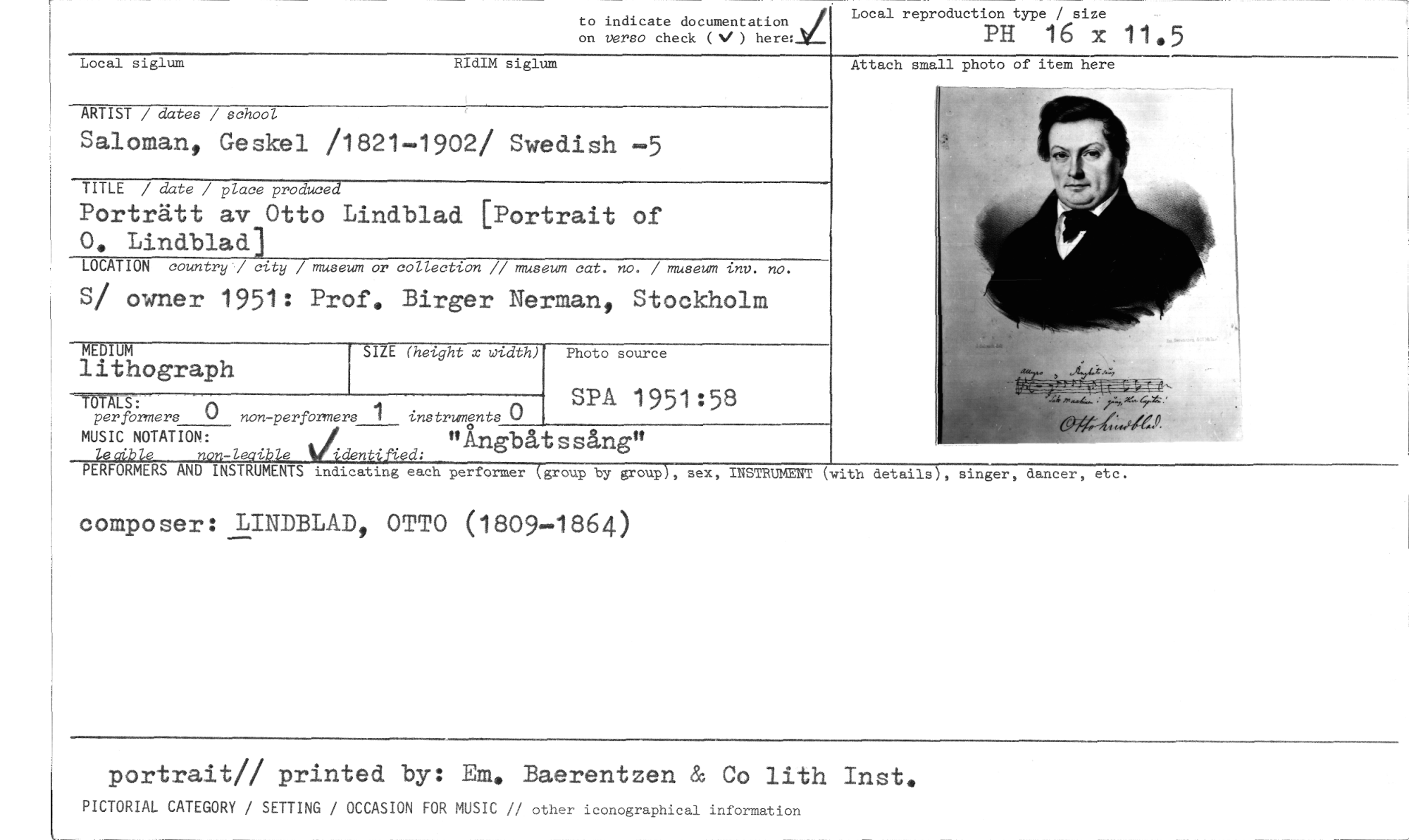 //// to indicate documentation on versa check (V ) here: //// Local reproduction type / size //// PH 16 x 11.5 //// Local siglum RIdIM siglum //// ARTIST / dates / school //// Saloman, Geskel /1821-1902/ Swedish -5 //// TITLE / date / place produced //// Porträtt av Otto Lindblad [Portrait of //// 0. Lindblad] //// LOCATION country / city / museum or collection // museum cat. no. / museum inv. no. //// S/ owner 1951: Prof. Birger Nerman, Stockholm //// MEDIUM //// lithograph //// TOTALS: SPA 1951:58 //// per formers 0 non-performers 1 instruments 0 //// MUSIC NOTATION: "Ångbåtssång" //// lesible non-leaihZe ied: //// PERFORMERS AND INSTRUMENTS indicating each performer //// SIZE (height x width) //// Photo source //// Attach small photo of item here //// group by group , sex, INSTRUMENT (with details), singer, dancer, etc. //// composer: LINDBLAD, OTTO (1809-1864) //// portrait// printed by: Em. Baerentzen & Co lith Inst. //// PICTORIAL CATEGORY / SETTING / OCCASION FOR MUSIC // other iconographical information ////