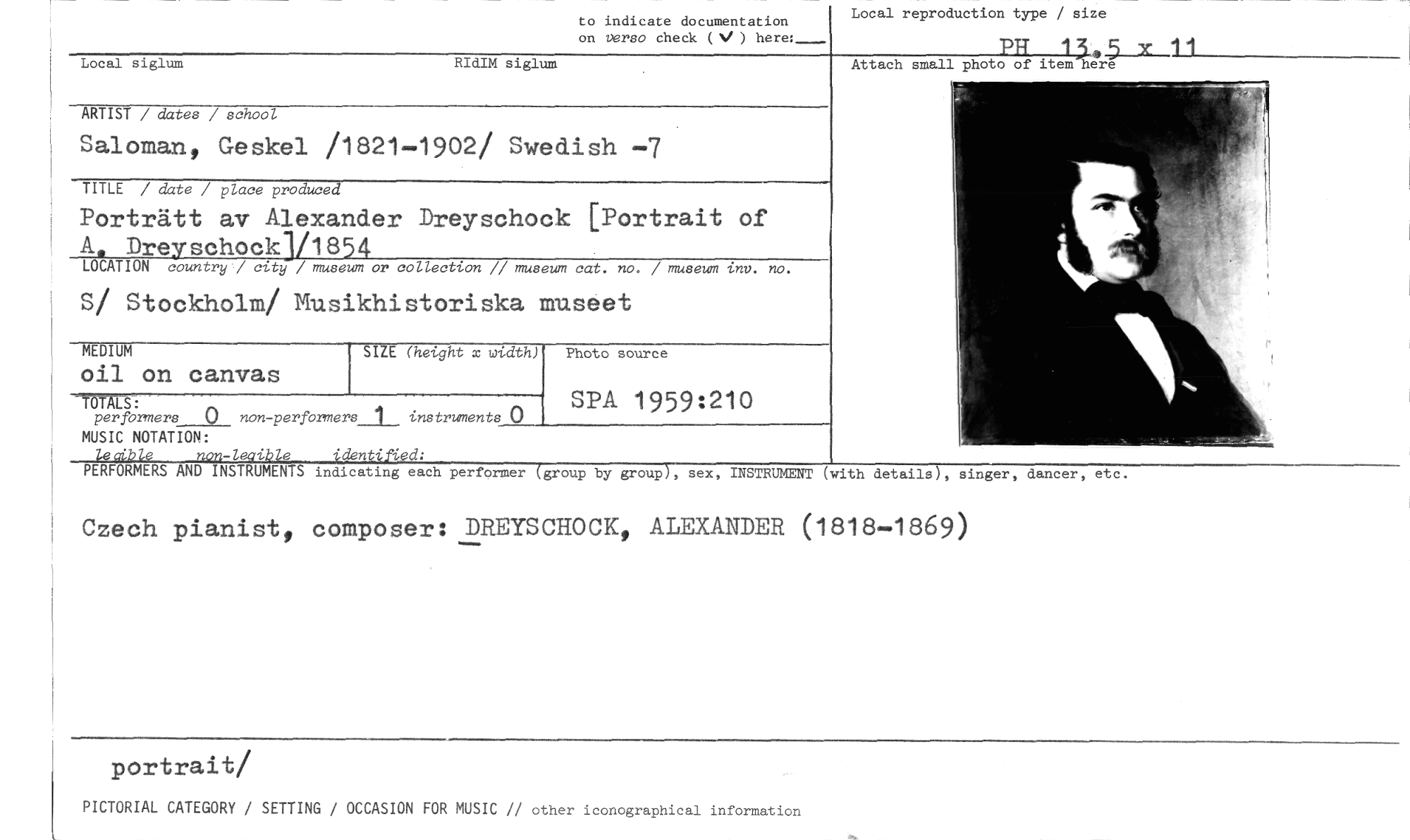 //// Czech pianist, composer: DREYSCHOCK, ALEXANDER (1818-1869) //// portrait/ //// PICTORIAL CATEGORY / SETTING / OCCASION FOR MUSIC // other iconographical information //// to indicate documentation //// on verso check (N/ ) here:_ //// Local reproduction type / size //// PR 13,5 x 11 //// Attach small photo of item here //// ARTIST / dates / school //// Saloman, Geskel /1821-1902/ Swedish -7 //// TITLE / date / place produced //// Porträtt av Alexander Dreyschock [Portrait of A. Dreyschock]/1854 //// LOCATION country / city / museum or collection // museum cat. no, / museum inv. no. //// S/ Stockholm/ Musikhistoriska museet //// SIZE (height x width) //// TOT LS: //// per forners 0 non-performers_l_ instruments 0 //// MUSIC NOTATION: //// 4e4ible non-leaible identified: //// PERFORMERS AND INSTRUMENTS indicating each performer (group by group), sex, //// INSTRUMENT (with details), singer, dancer, etc. //// RIdIM siglum //// Local siglum //// MEDIUM //// oil on canvas //// Photo source //// SPA 1959:210 ////