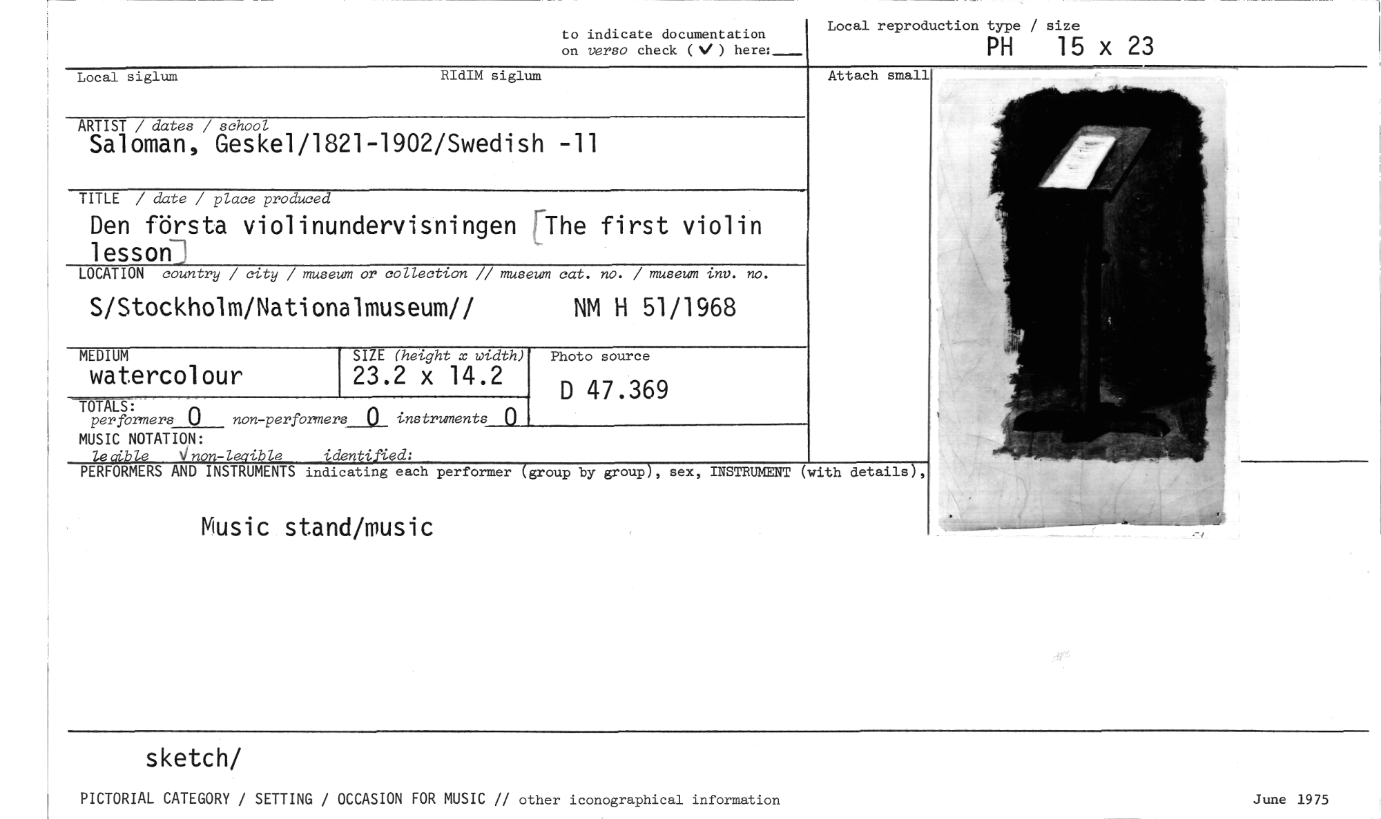//// to indicate documentation on verso check (V ) here: //// Local reproduction type / size //// PH 15 x 23 //// Attach small //// ARTIST / dates / school //// Saloman, Geske1/1821-1902/Swedish -11 //// TITLE / date / place produced //// Den första violinundervisningen rThe first violin //// lesson7 //// LOCATION country / city / museum or collection // museum cat. no. / museum inv. no. //// S/Stockholm/Nationalmuseum// NM H 51/1968 //// SIZE (height x width) //// 23.2 x 14.2 //// TOTALS: //// per formers 0 non-performers_Q_ instruments 0 //// MUSIC NOTATION: //// Vnon-leaikle PERFORMERS AND INSTRUMENTS indicating each performer (group by group), sex, INSTRUMENT (with details), //// Music stand/music //// MEDIUM //// watercolour //// Photo source //// D 47.369 //// Local siglum RIdIM siglum //// sketch/ //// PICTORIAL CATEGORY / SETTING / OCCASION FOR MUSIC // other iconographical information June 1975 ////
