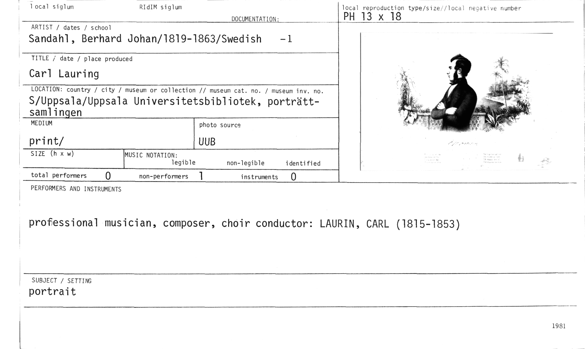 //// 1 ocal siglum RIdIM siglum //// DOCUMENTATION' //// 1 ARTIST / dates / school //// Sandahl, Berhard Johan/1819-1863/Swedish -1 //// TITLE / date / place produced //// Carl Lauring //// LOCATION: country / city / museum or collection // museum cat. no. / museum inv. no. //// S/Uppsala/Uppsala Universitetsbibliotek, porträttsamlingen //// photo source //// local reproduction type/size//local negative number //// PH 13 x 18 //// MEDIUM //// print/ //// UUB //// SIZE (h x w //// MUSIC NOTATION: //// legible //// non-legible identified //// total performers Q non-performers 1 instruments //// PERFORMERS AND INSTRUMENTS //// professional musician, composer, choir conductor: LAURIN, CARL (1815-1853) //// SUBJECT / SETTING //// portrait //// 1981 ////