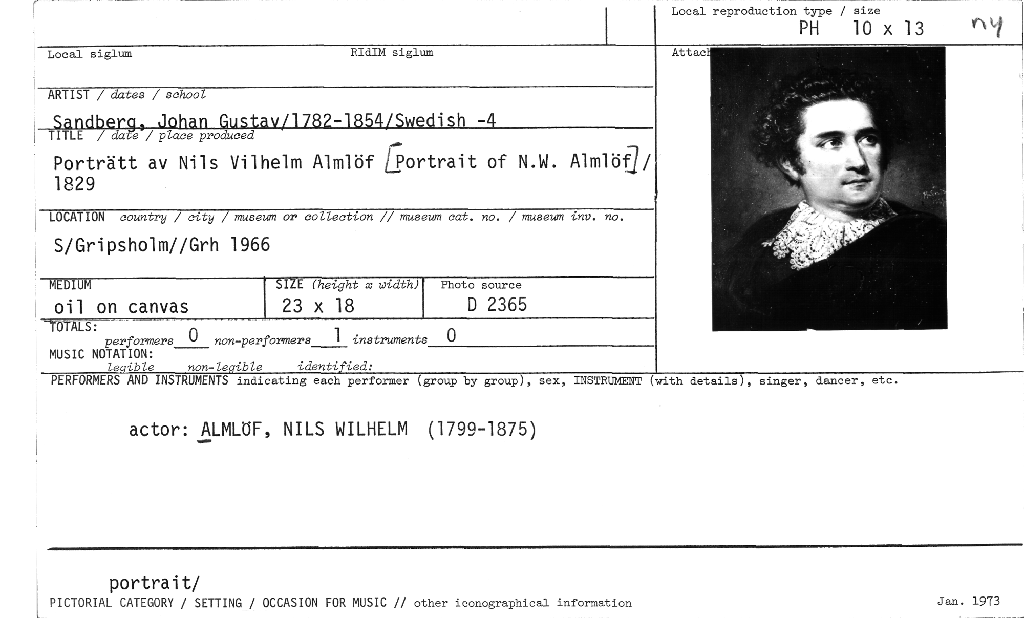 //// Local reproduction type / size //// PH 10 x 13 //// Attac //// Photo source //// D 2365 //// oil on canvas //// MEDIUM //// SIZE (height x width) //// 23 x 18 //// singer, dancer, etc. //// PERFORMERS AND INSTRUMENTS indicating each performer (group by group), sex, INSTRUMENT (with details), //// actor: ALMLÖF, NILS WILHELM (1799-1875) //// Jan. 1973 //// portrait/ //// PICTORIAL CATEGORY / SETTING / OCCASION FOR MUSIC // other iconographical information //// Local siglum RIdIM siglum //// ARTIST / dates / school //// Sandberg, Johan Gustav/1782-1854/Swedish -4 TITLE / date / place produced //// Porträtt av Nils Vilhelm Almlöf LPortrait of N.W. Almlöfl/ 1829 //// LOCATION country / city / museum or collection // museum cat. no. / museum tnv. no. //// S/Gripsholm//Grh 1966 //// TOTALS: //// performers 0 non-performers 1 instruments //// MUSIC NOTATION: //// legible non-legible identified: //// 0 ////