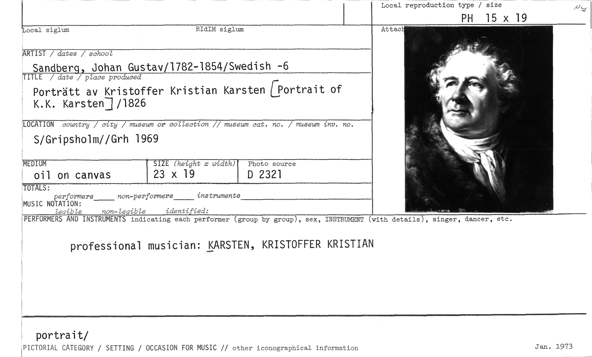 //// ILocal siglum //// RIdIM siglum Attac //// Local reproduction type / size //// PH 15 x 19 //// SIZE (hetght x width) //// 23 x 19 //// Photo source //// D 2321 //// ARTIST / dates / school //// Sandberg, Johan Gustav/1782-1854/Swedish -6 //// TITLE / date / place produced //// Porträtt av Kristoffer Kristian Karsten LPortrait of K.K. Karsten:1/1826 //// L.00ATION country / city / museum or collection // museum cat. no. / museum inv. no. //// S/Gripsholm//Grh 1969 //// MEDIUM //// oil on canvas //// 70TAT3: //// performers non-performers instruments //// MUSIC NOTATION: //// legible non-legible identified: //// PERFORMERS AND INSTRUMENTS indicating each performer (group by group), sex, INSTRUMENT (with details), singer, dancer, etc. //// professional musician: KARSTEN, KRISTOFFER KRISTIAN //// portrait/ //// PICTORIAL CATEGORY / SETTING / OCCASION FOR MUSIC // other iconographical information //// Jan. 1973 ////