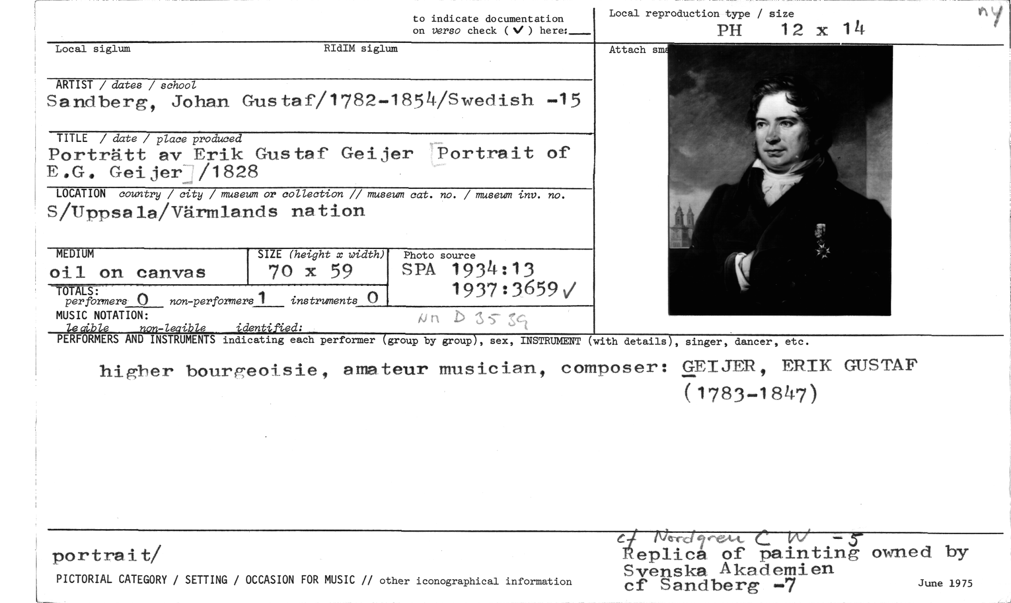 //// to indicate documentation Local reproduction type / size //// on versa check ( ) here:_ PH 12 x 14 //// Local siglum RIdIM siglum //// ARTIST / dates / school //// Sandberg, Johan Gustaf/1782-1854/Swedish -15 //// TITLE / date / place produced //// Porträtt av Erik Gustaf Geijer Portrait of E.G. Geijer /1828 //// LOCATION country / city / museum or collection // museum cat. no. / museum inv. no. //// S/Uppsala/Värmlands nation //// MUSIC NOTATION: //// Zealble non-leaible identified: //// PERFORMERS AND INSTRUMENTS indicating each performer (group by group), sex, INSTRUMENT (with details), singer, dancer, etc. //// higher bourgeoisie, amateur musician, composer: GEIJER, ERIK GUSTAF //// (1783-1847) //// c i erclire.,t-t C -5- //// eplica of painting owned by Svenska. Akademien //// cf Sandberg —7 June 1975 //// portnreit/ //// PICTORIAL CATEGORY / SETTING / OCCASION FOR MUSIC // other iconographical information //// MEDIUM //// oil on canvas //// OTALS: //// per formers () non-perfbrmers 1 instruments () //// Photo source //// SPA 1934:13 //// 1937:3659V //// SIZE (height x width) //// 70 x 59 //// Attach sm ////